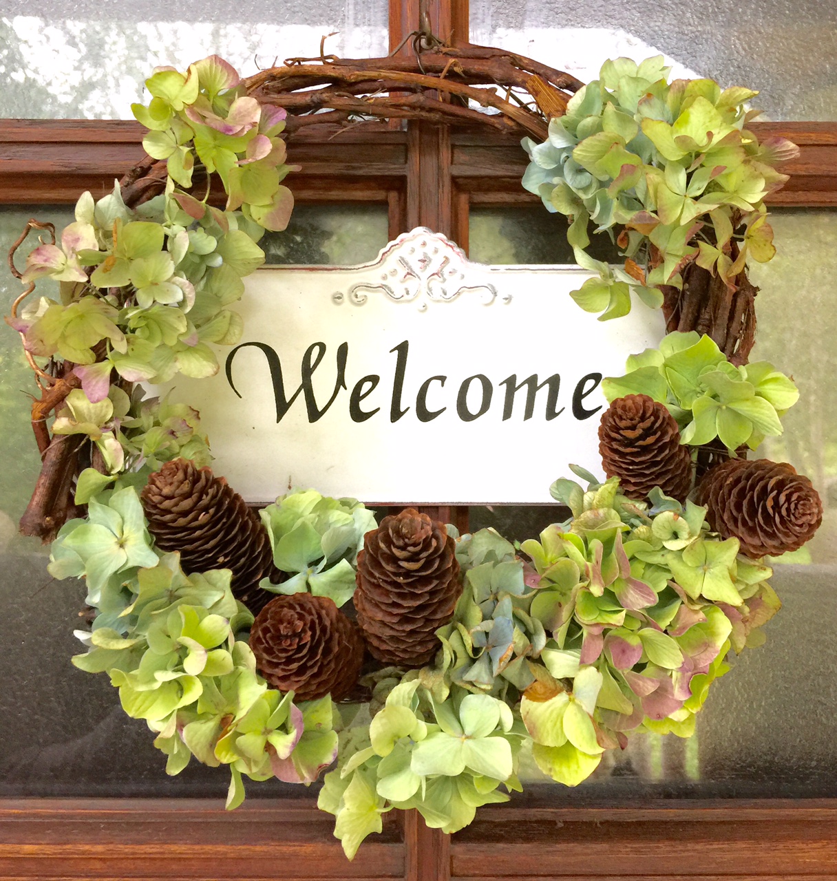 秋色に染まったアジサイとエゾアカマツの松ぼっくりを組み合わせた初秋のリース。(y)