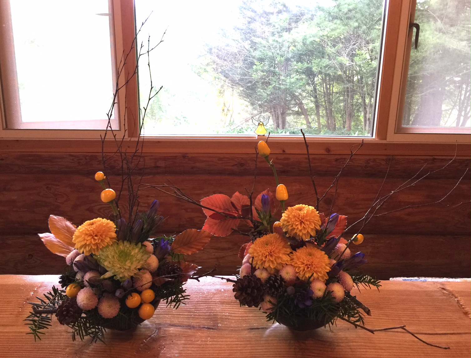 フラワーレッスン 生徒さんの作品です 2016.09.22 00:11 ピンポンマムを使って白樺の小枝、松ぼっくり、リンドウ、トウガラシ、ファーガスと組み合わせました。生花と合わせると小枝と松ぼっくりに生命力が蘇ります。(y)