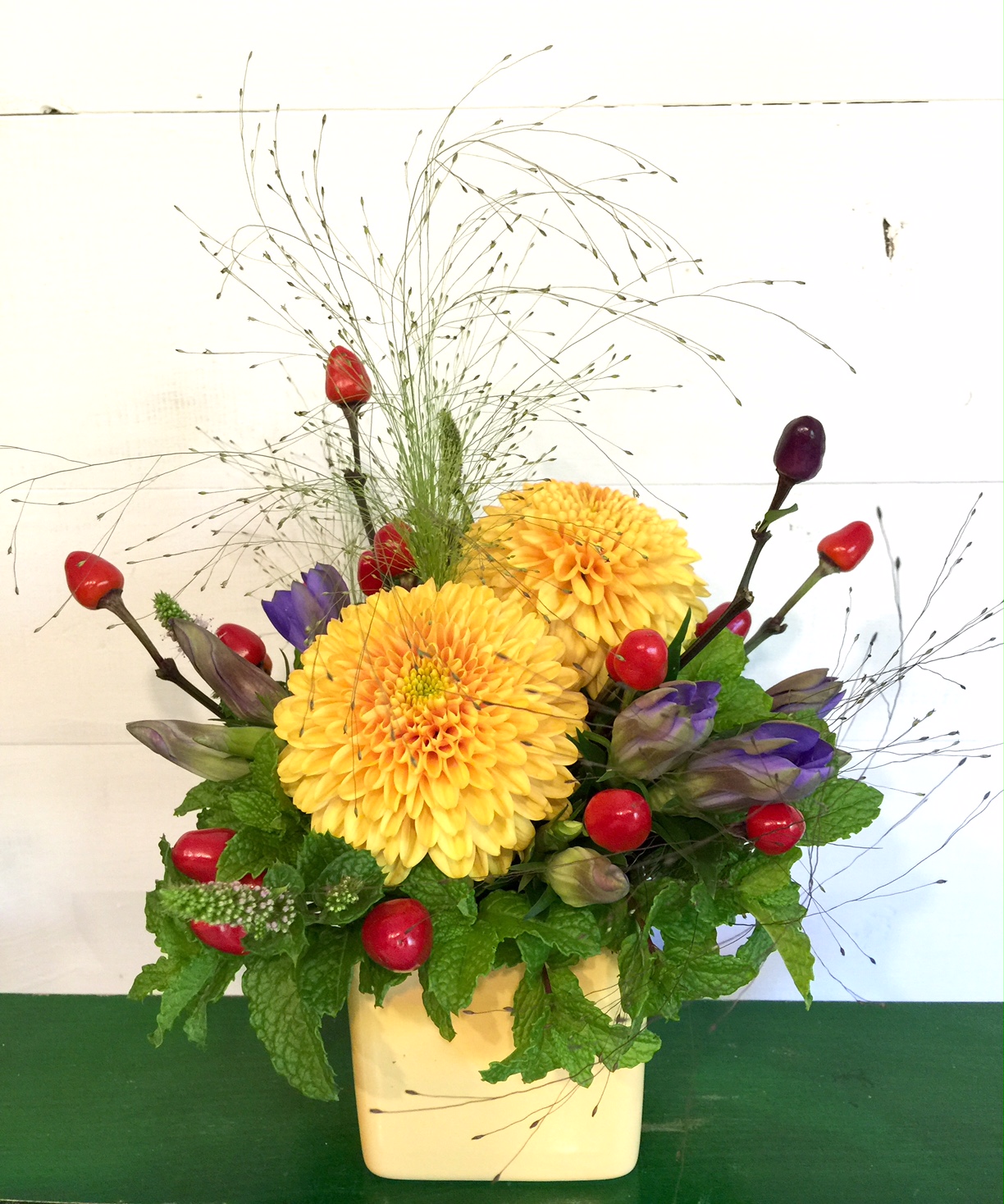 フラワーレッスン 生徒さんの作品です 2016.09.25 01:49 小さめの器に大きめなピンポンマムを使ってアレンジしました。トウガラシの名前は「夜祭」。小さな提灯が灯って賑やかな雰囲気です。(y)