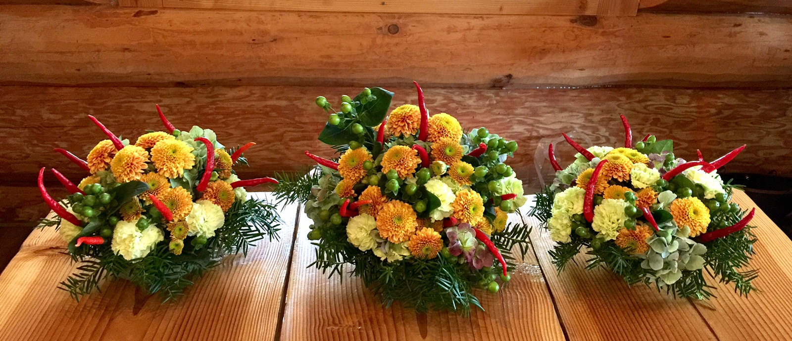 フラワーレッスン生徒さんの作品です 2016.10.08 21:59 器持参のレッスン。トウガラシとアジサイはワイヤリングを施して挿しやすくしました。今日のテーマはこんもりと器に活ける。思い思いなこんもりに仕上がりました。(y)