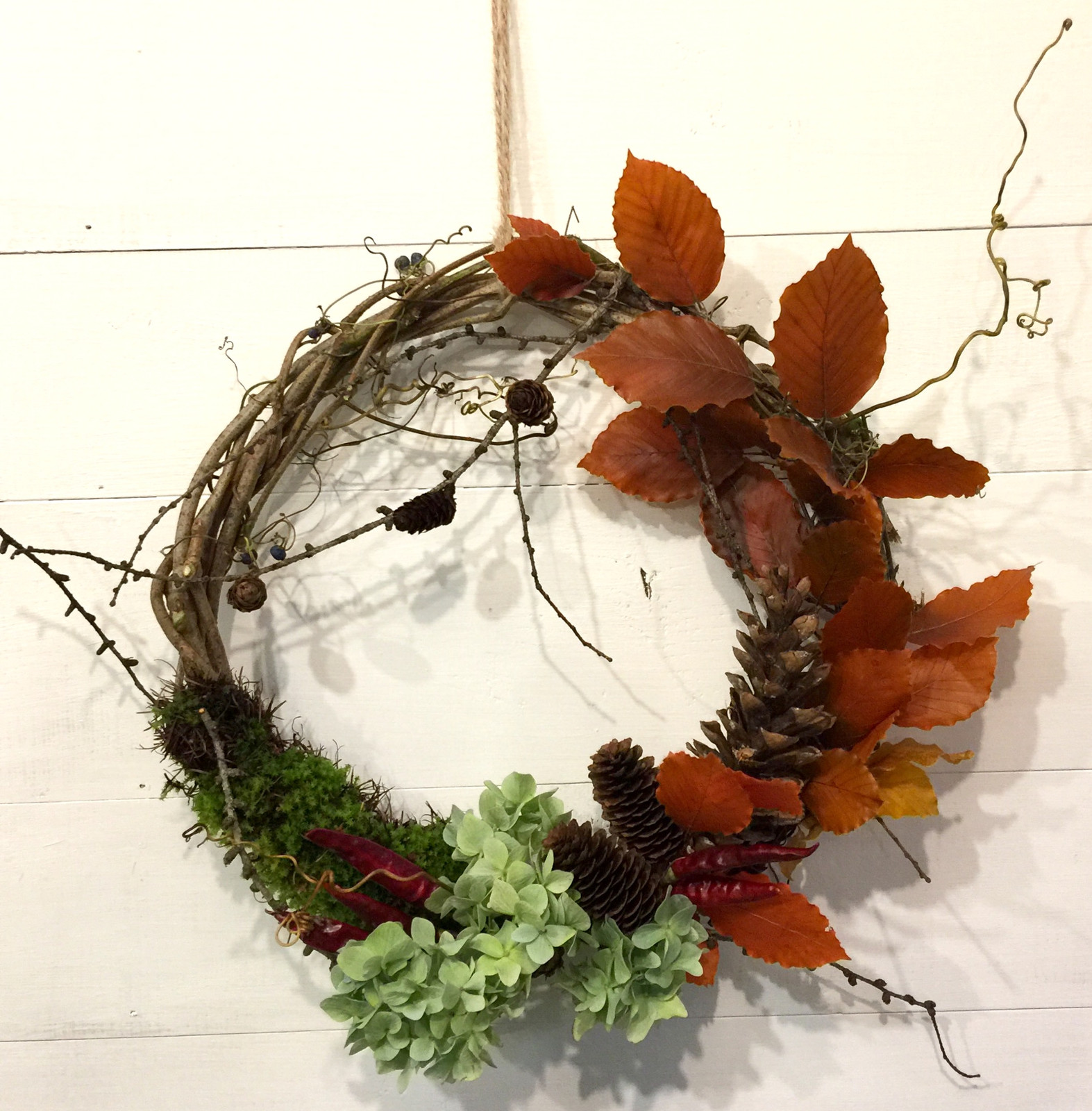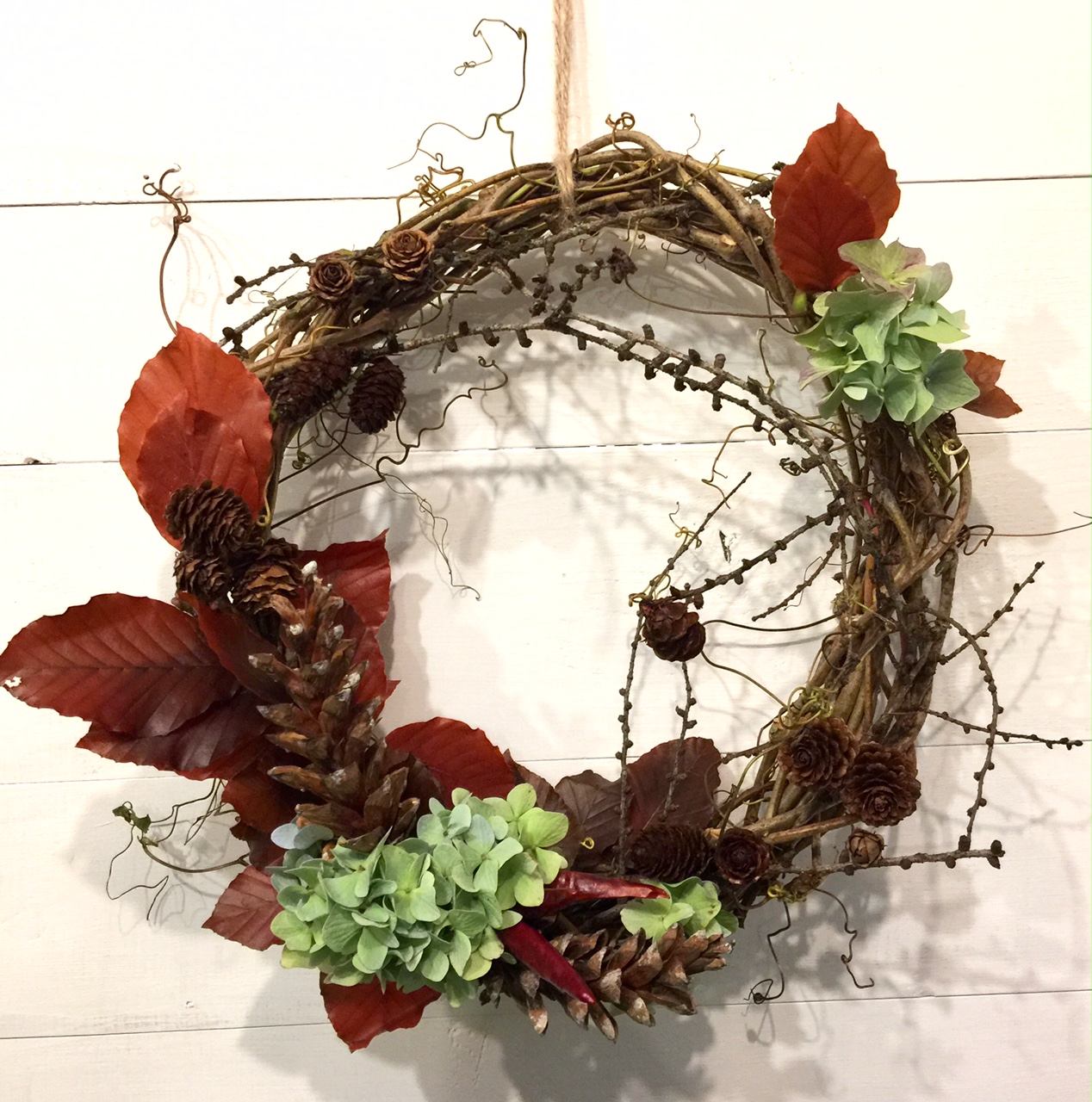 フラワーレッスン生徒さんの作品です 2016.10.12 22:29 ガーデンから収穫した野ぶどうの蔓をベースに各々集めた素材で制作しました。落ちたてのカラマツの枝はしなやかなので丸く添わせるとリースに絡みます。(y)