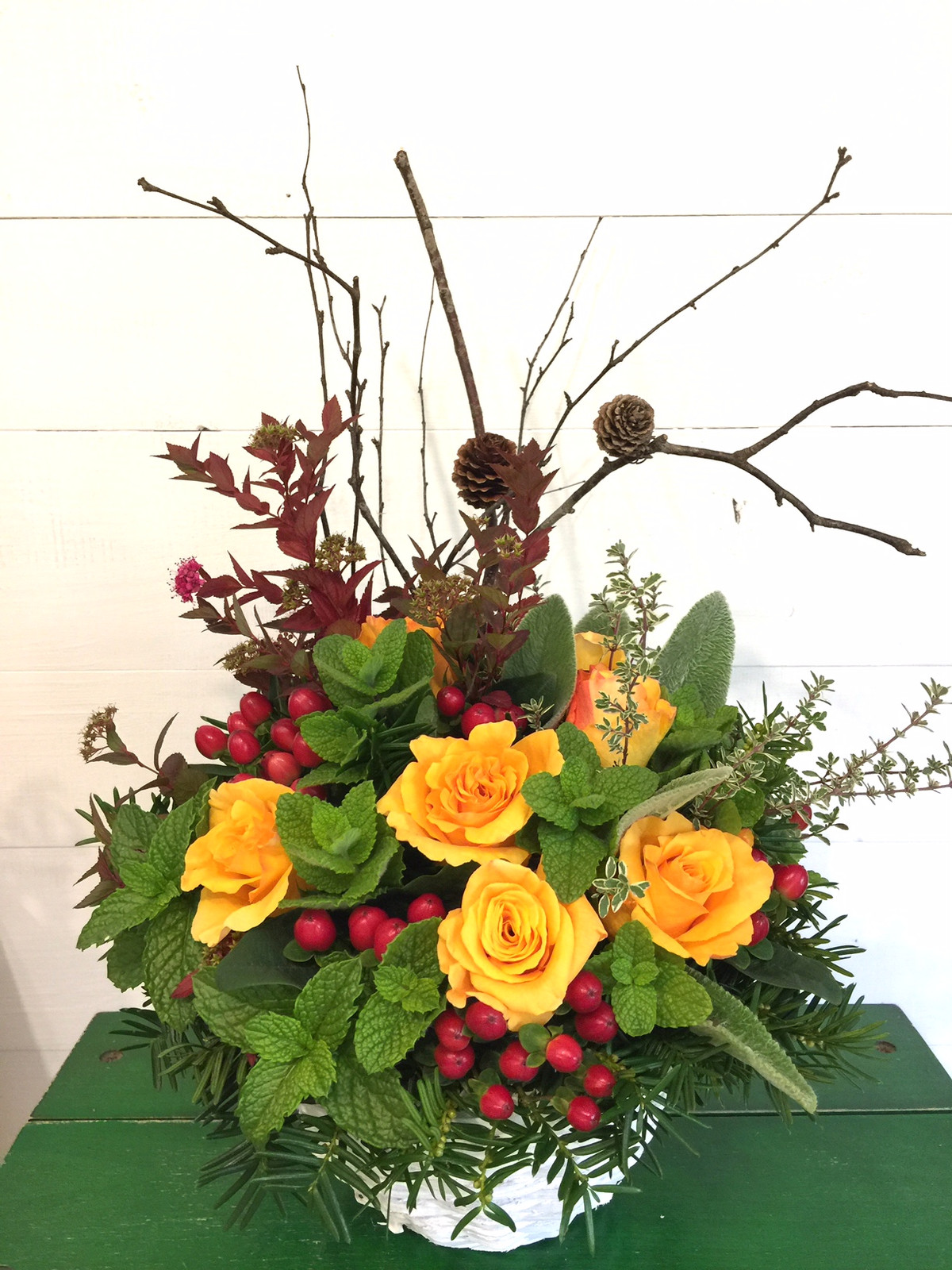 サロンに飾るアレンジメントは美流渡の紅葉を取り入れて季節を感じるインテリアに。(y)