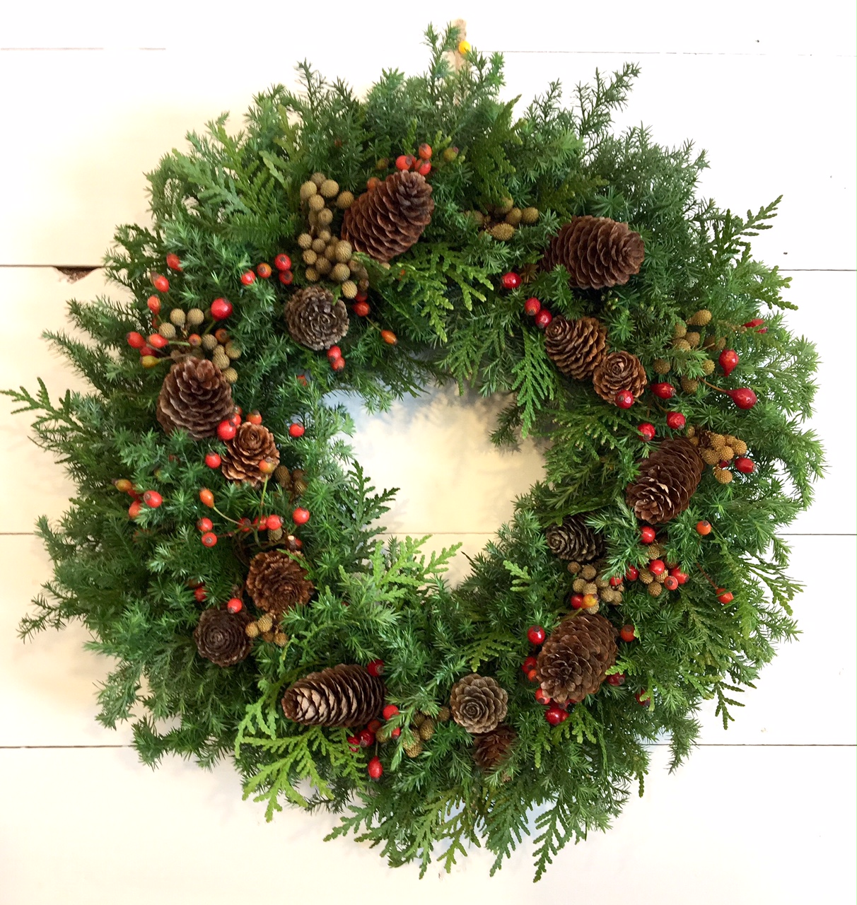 野ばらの実とネイティヴフラワー、松ぼっくりを散りばめたリース。外径30㎝ (y)