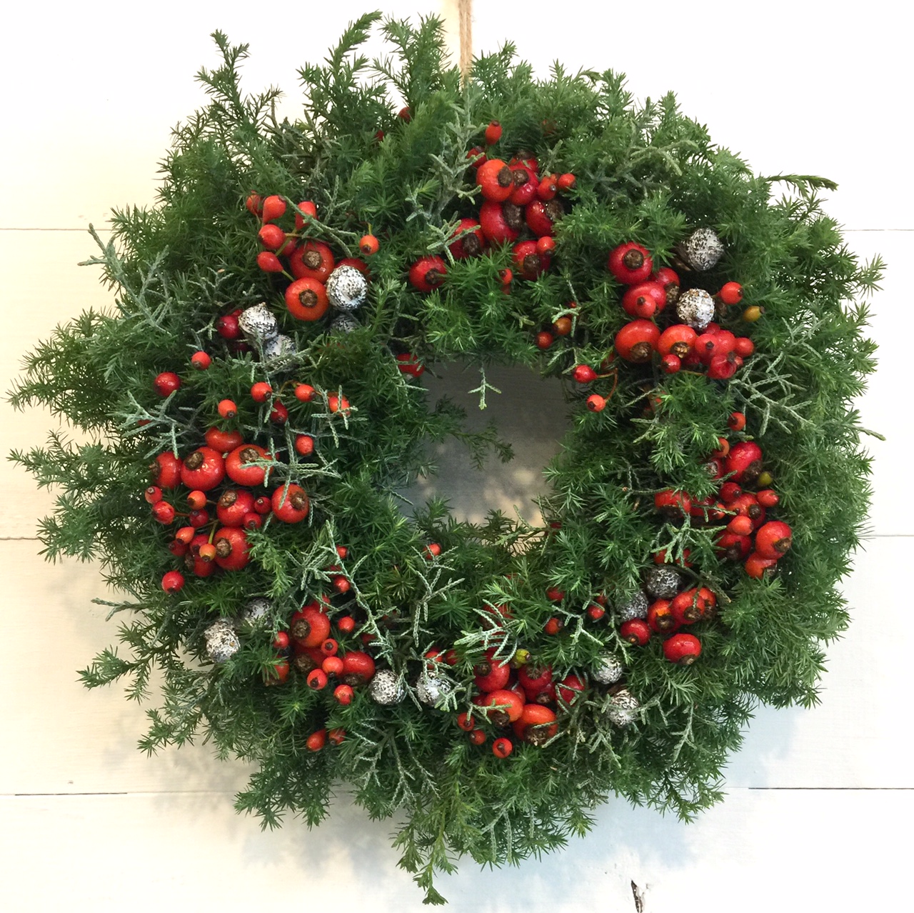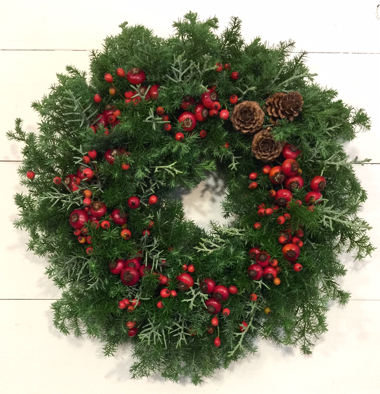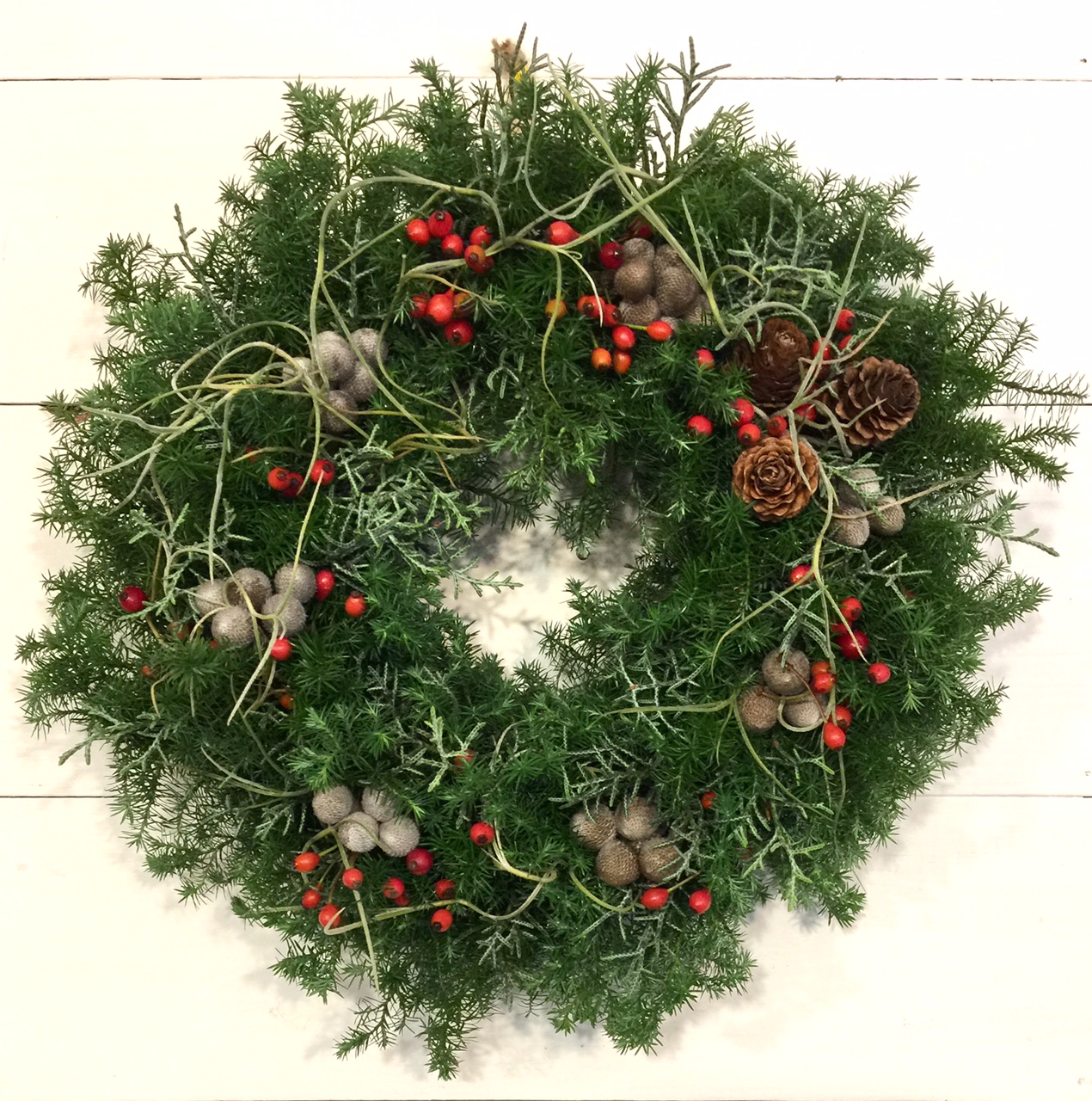 野ばらの実を入れて、少しずつネイティヴを加えた3種のリースと、美流渡の松ぼっくりを入れたシンプルなリース。(y)
