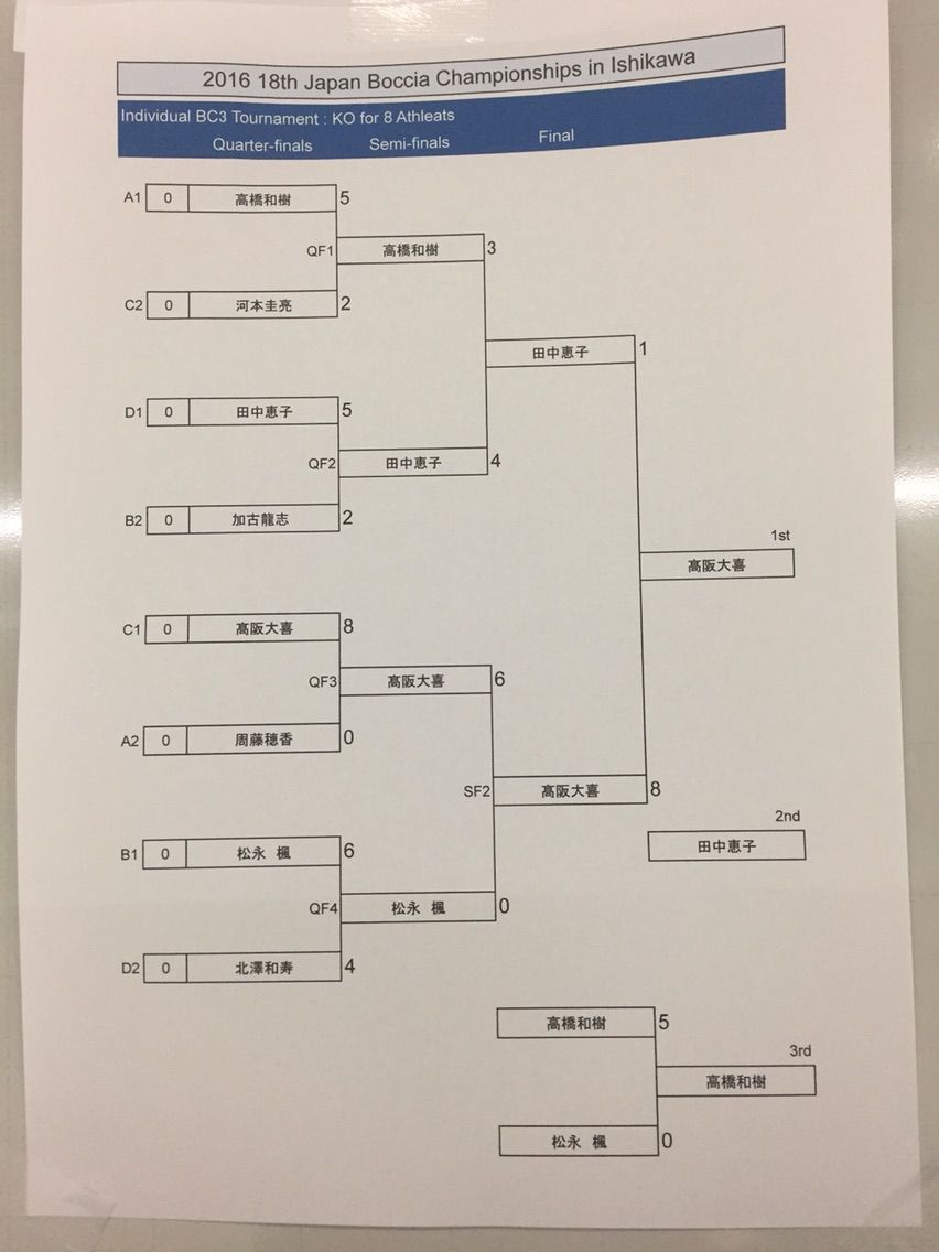 全体を通して自分の試合は、良い試合と全く良くない試合との差が激しすぎ。様々な部分で自分自身の甘さや相手のことを考えすぎて自分のプレーを見失ったり課題が見えた。ボッチャを始めてからここまで自分が情けないと思ったのは初めてのこと。