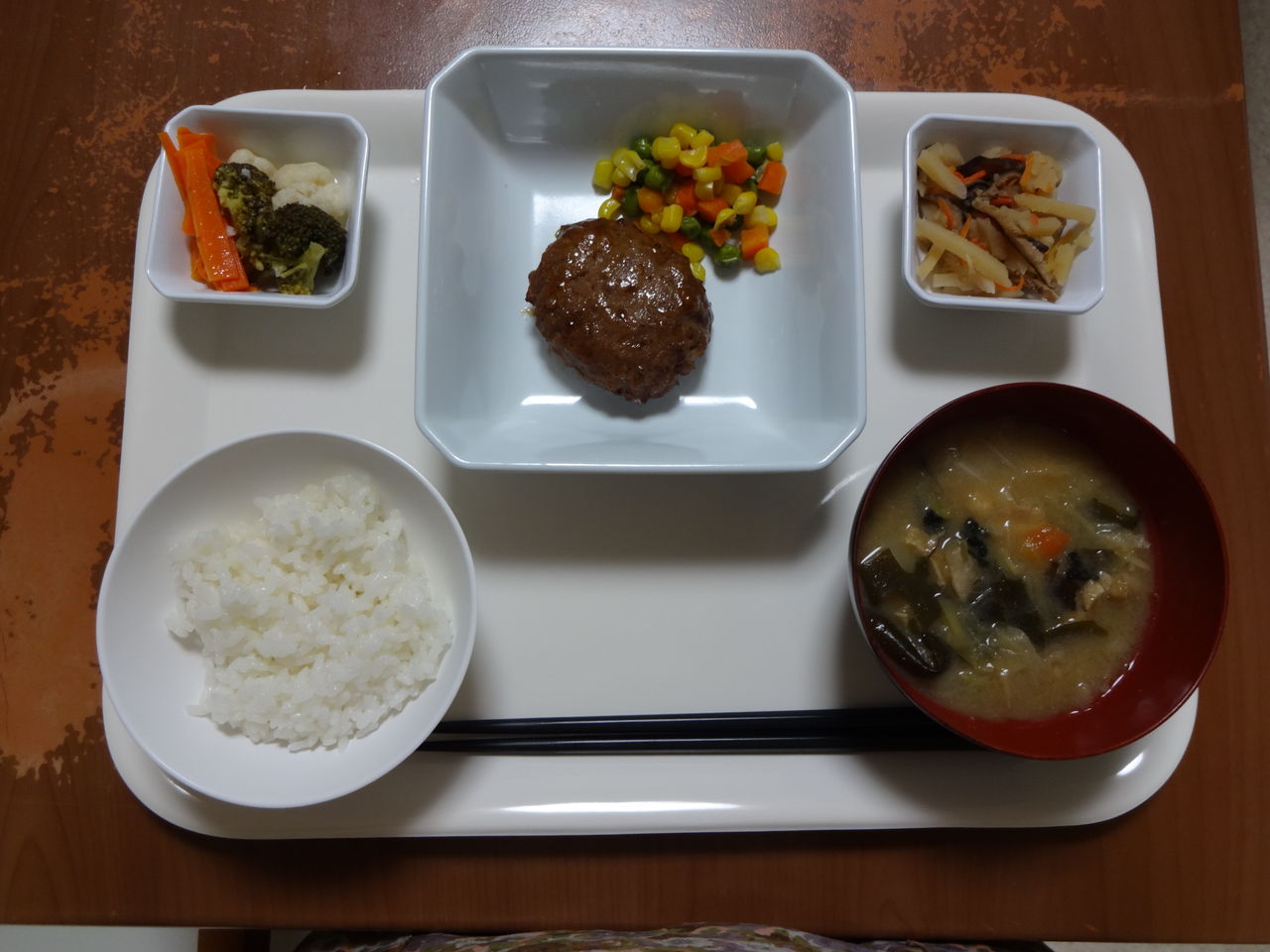 本日のメニュー 2013.12.17 04:05 本日のメニューです(12月17日)〈昼食〉 主食 ご飯 味噌汁主菜 サバの煮つけ副菜 春雨の生姜炒め添物 さつま芋甘露煮 青菜のしその実和え〈夕食〉 主食 ご飯 トン汁主菜 ビーフハンバーグ副菜 温野菜サラダ添物 ジャガイモとシイタケの甘辛煮 ベジタブルソテー
