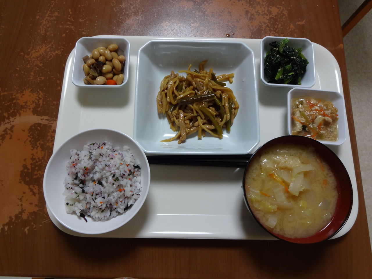本日のメニュー 2013.12.24 04:03 本日のメニューです(12月24日)〈昼食〉 主食 ご飯 中華春雨スープ主菜 鮭つみれの中華野菜あん副菜 焼きビーフン添物 昆布大根〈夕食〉 主食 混ぜご飯 味噌汁主菜 豚肉とニンニクの芽炒め副菜 青菜のピーナッツ和え添物 五目豆