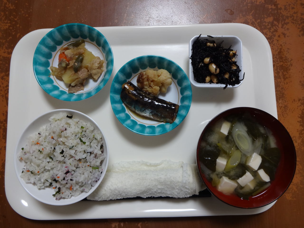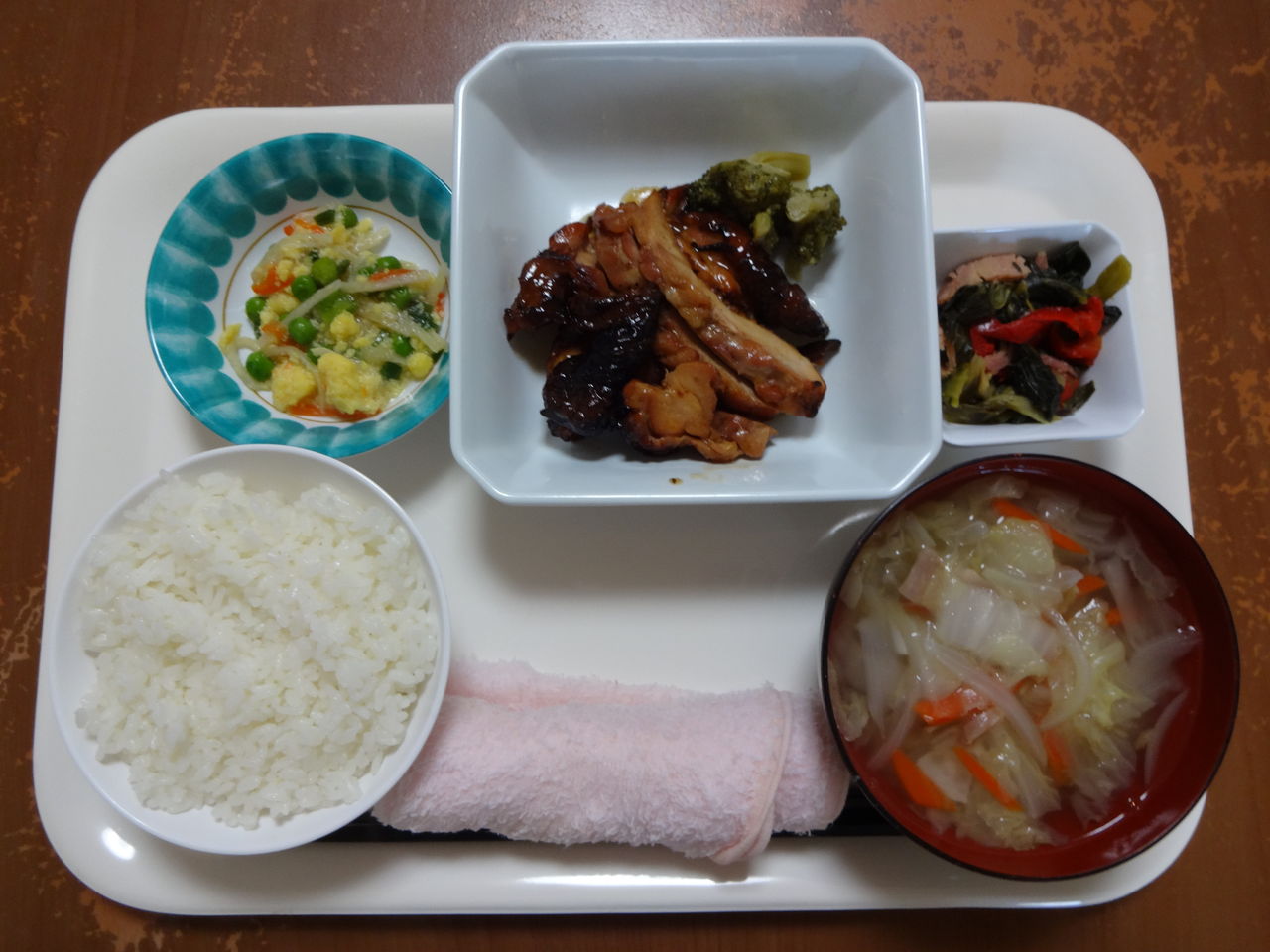 本日のメニュー 2014.01.21 09:39 本日のメニューです(1月21日) 〈昼食〉 主食 ご飯 野菜スープ 主菜 照り焼きチキン 副菜 えんどう豆の卵和え 添物 青梗菜とハムの炒め物 〈夕食〉 主食 しそ青菜ご飯 味噌汁 主菜 いわしのオレンジ煮 副菜 肉じゃが 添物 ひじき豆