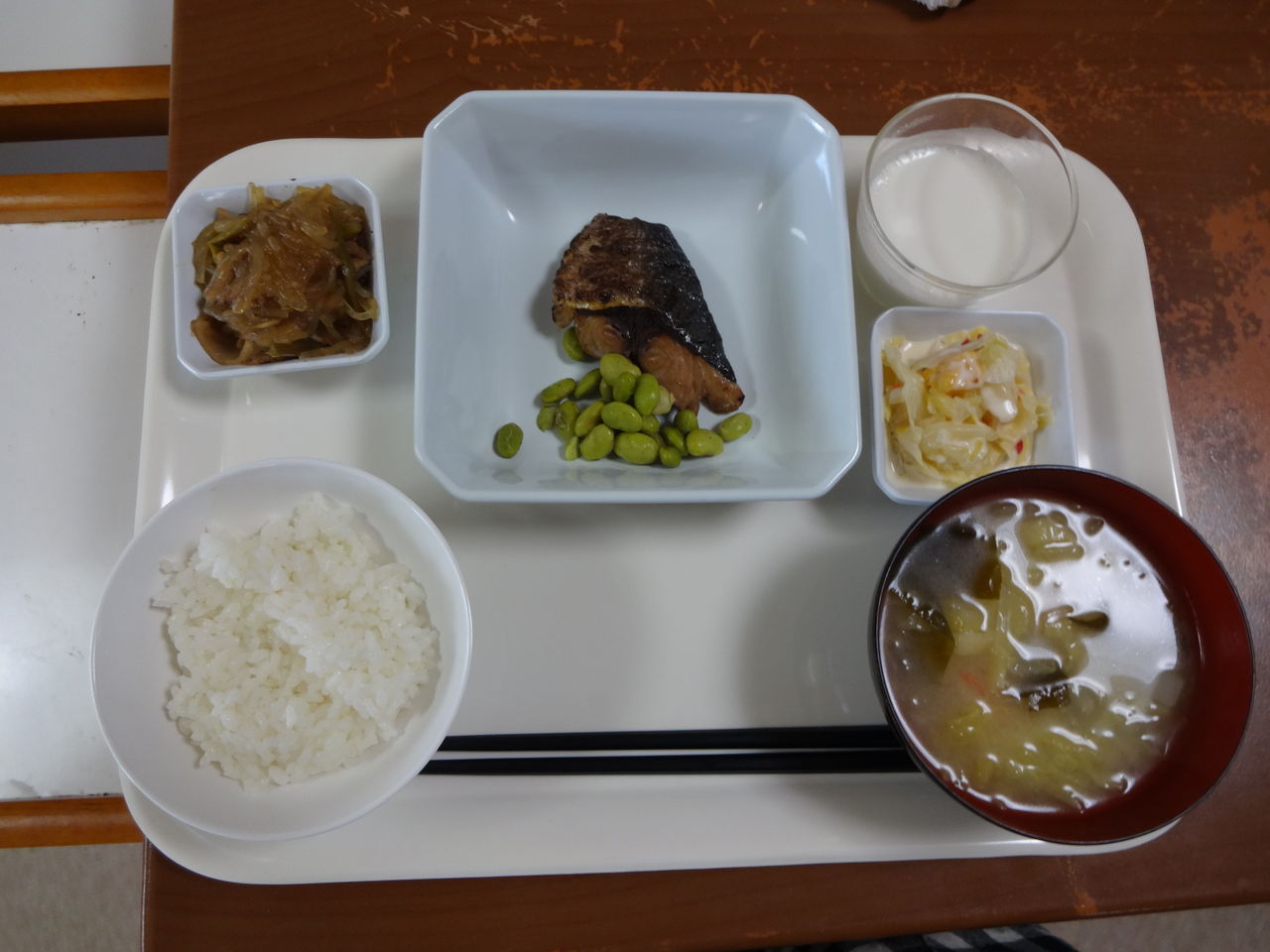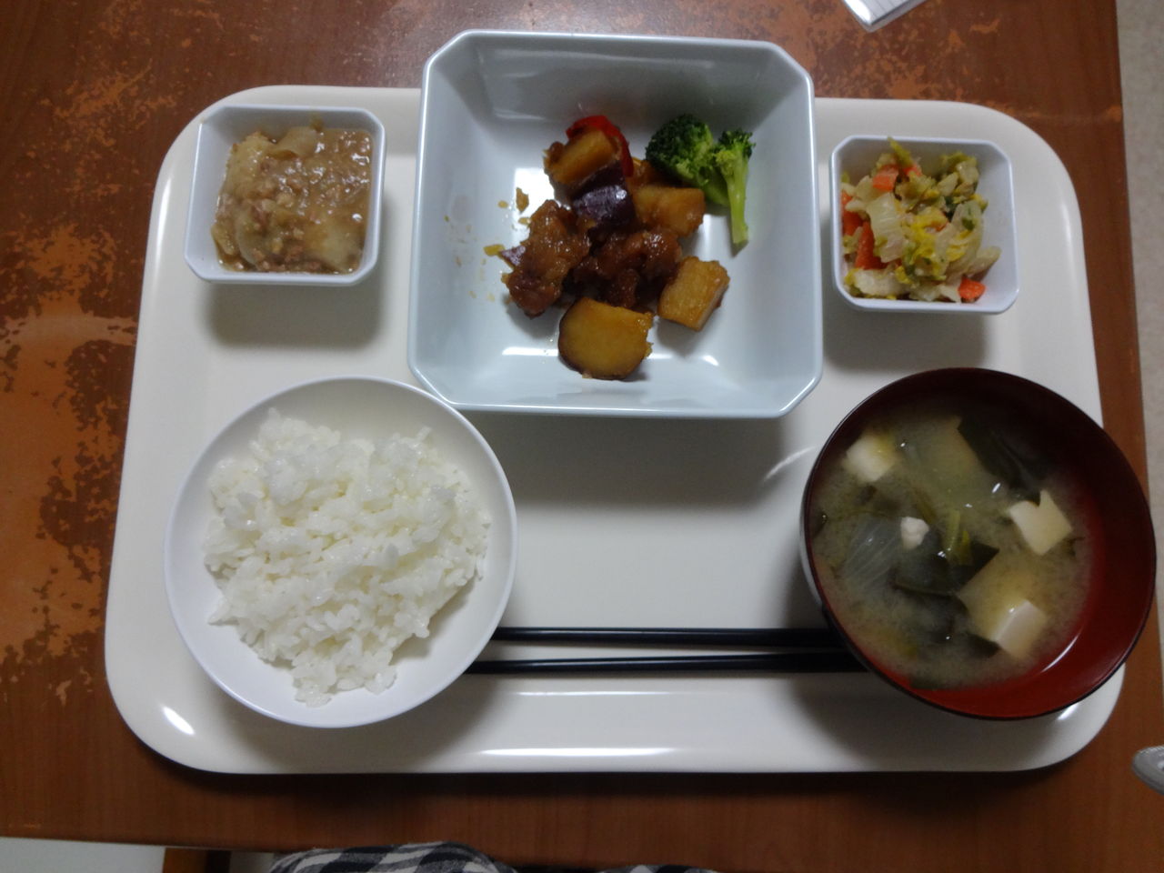 本日のメニュー 2014.01.22 04:58 本日のメニューです(1月22日)〈昼食〉 主食 ご飯 味噌汁主菜 ぶりの照り焼き副菜 豚肉と春雨の生姜炒め添物 コールスローサラダ 杏仁豆腐〈夕食〉 主食 ご飯 味噌汁主菜 さつま芋と鶏肉の炒め物副菜 ひき肉と里芋の味噌に添物 白菜の胡麻和え ブロッコリー