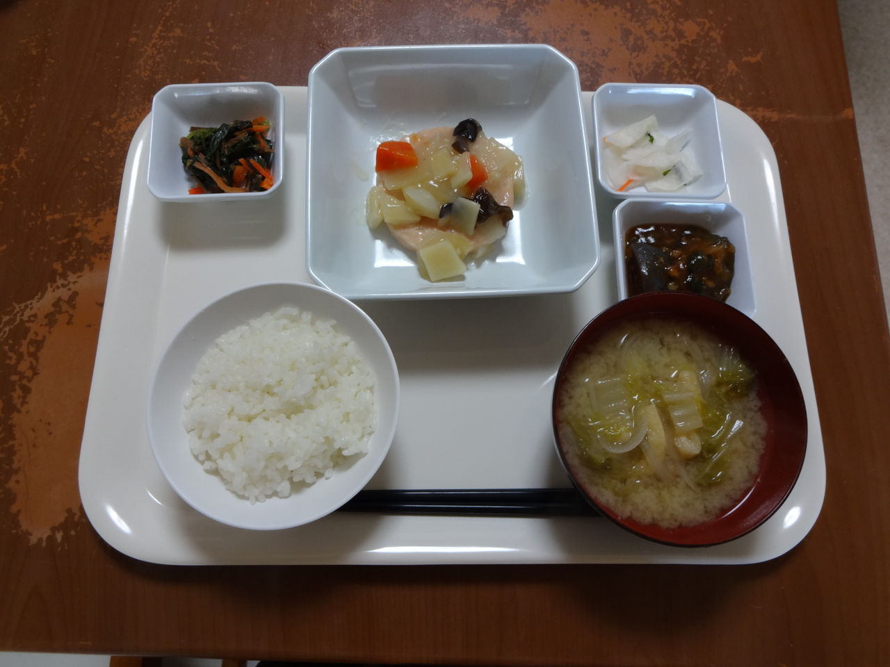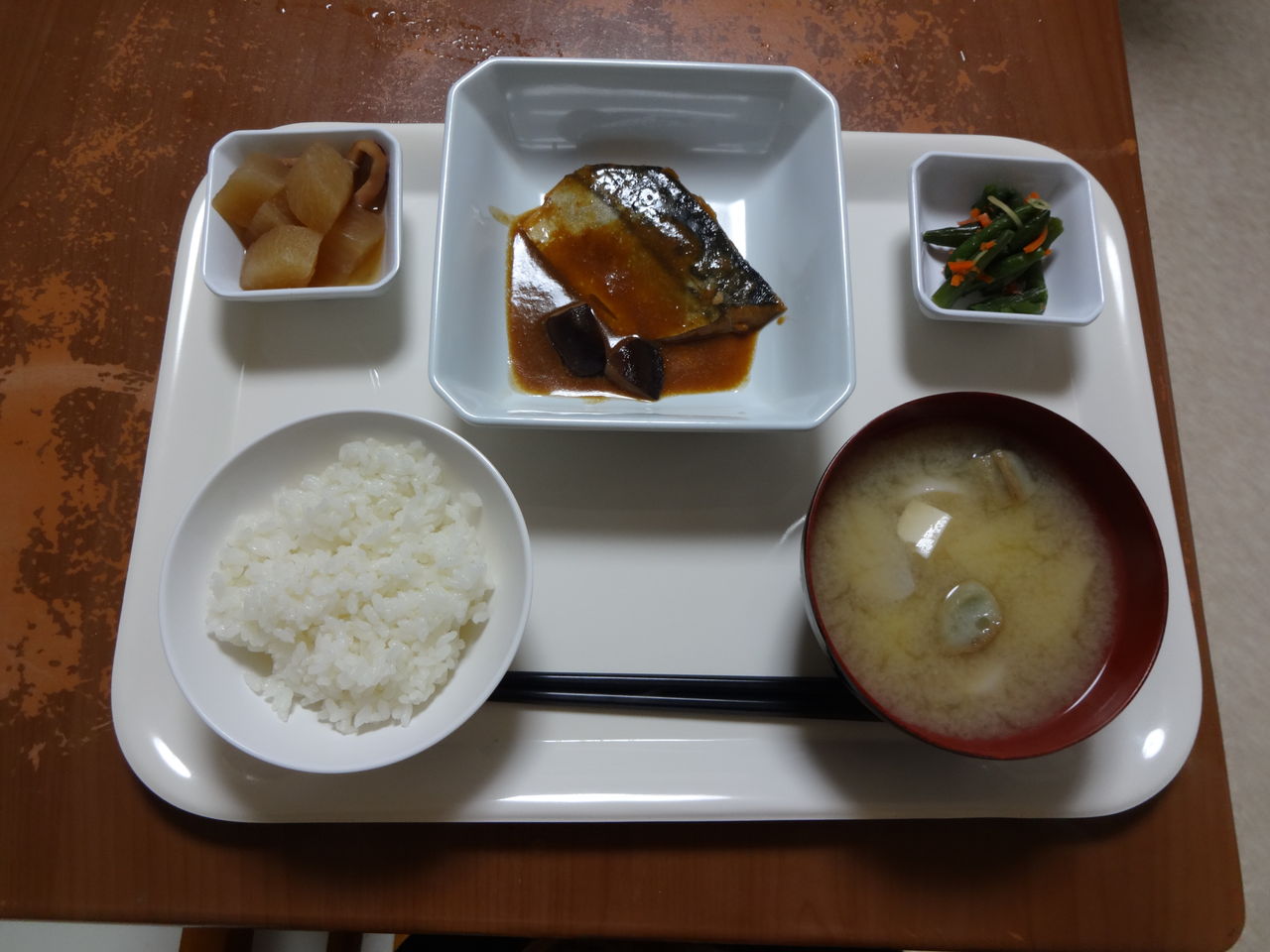 本日のメニュー 2014.01.27 04:37 本日のメニューです(1月27日)〈昼食〉 主食 ご飯 味噌汁主菜 鮭つみれの中華野菜あん副菜 マーボーナス添物 3色ナムル 大根風味漬け〈夕食〉 主食 ご飯 味噌汁主菜 サバの味噌煮副菜 イカ大根添物 インゲンの生姜醤油和え シイタケのだし煮