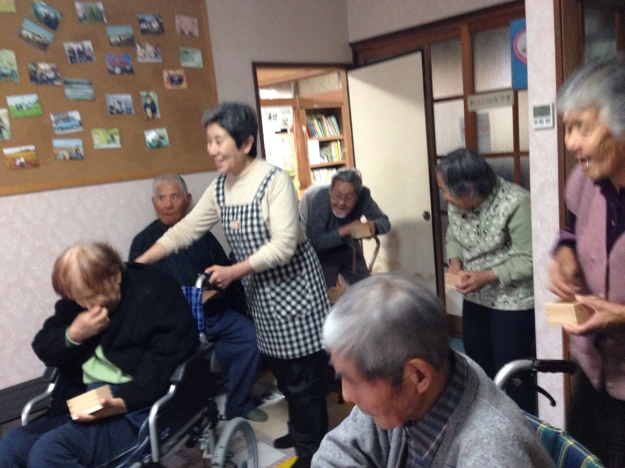 今日は節分なので、皆さんで近所の神社に行き、豆まきに参加しおやつをいっぱい取りました