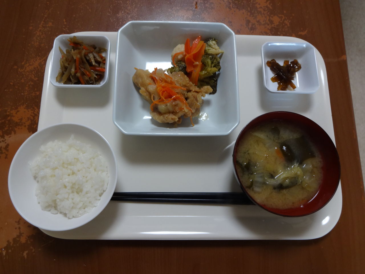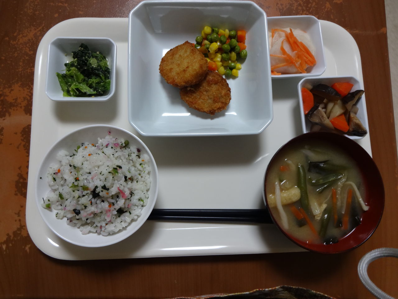 本日のメニュー 2014.02.07 03:19 本日のメニューです(2月7日)〈昼食〉 主食 ご飯 味噌汁主菜 チキンの南蛮漬け副菜 牛蒡きんぴら添物 ゆずわかめ 温野菜サラダ〈夕食〉 主食 混ぜご飯 味噌汁主菜 コロッケ副菜 吹き寄せ煮添物 青菜のピーナッツ和え カブの漬物