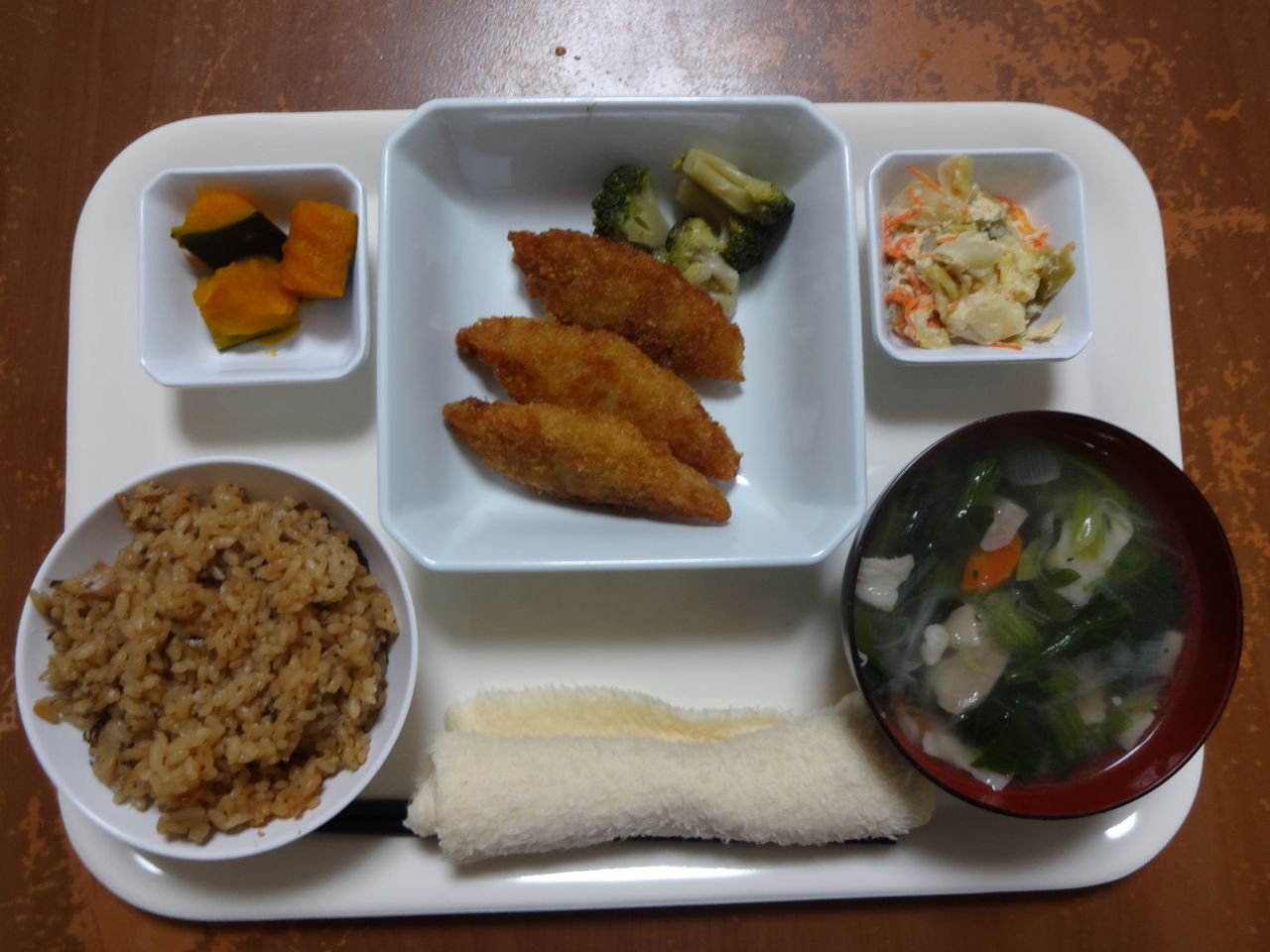 本日のメニュー 2014.02.14 10:26 本日のメニューです(2月14日) 〈昼食〉 主食 ご飯 味噌汁 主菜 さつま芋と鶏肉の煮物 副菜 野菜真丈 添物 ごぼうきんぴら 赤大根 〈夕食〉 主食 塩昆布の炊き込みご飯 野菜スープ 主菜 白身魚フライ 副菜 かぼちゃの煮物 添物 キャベツと蒸し鶏のマスタード和え