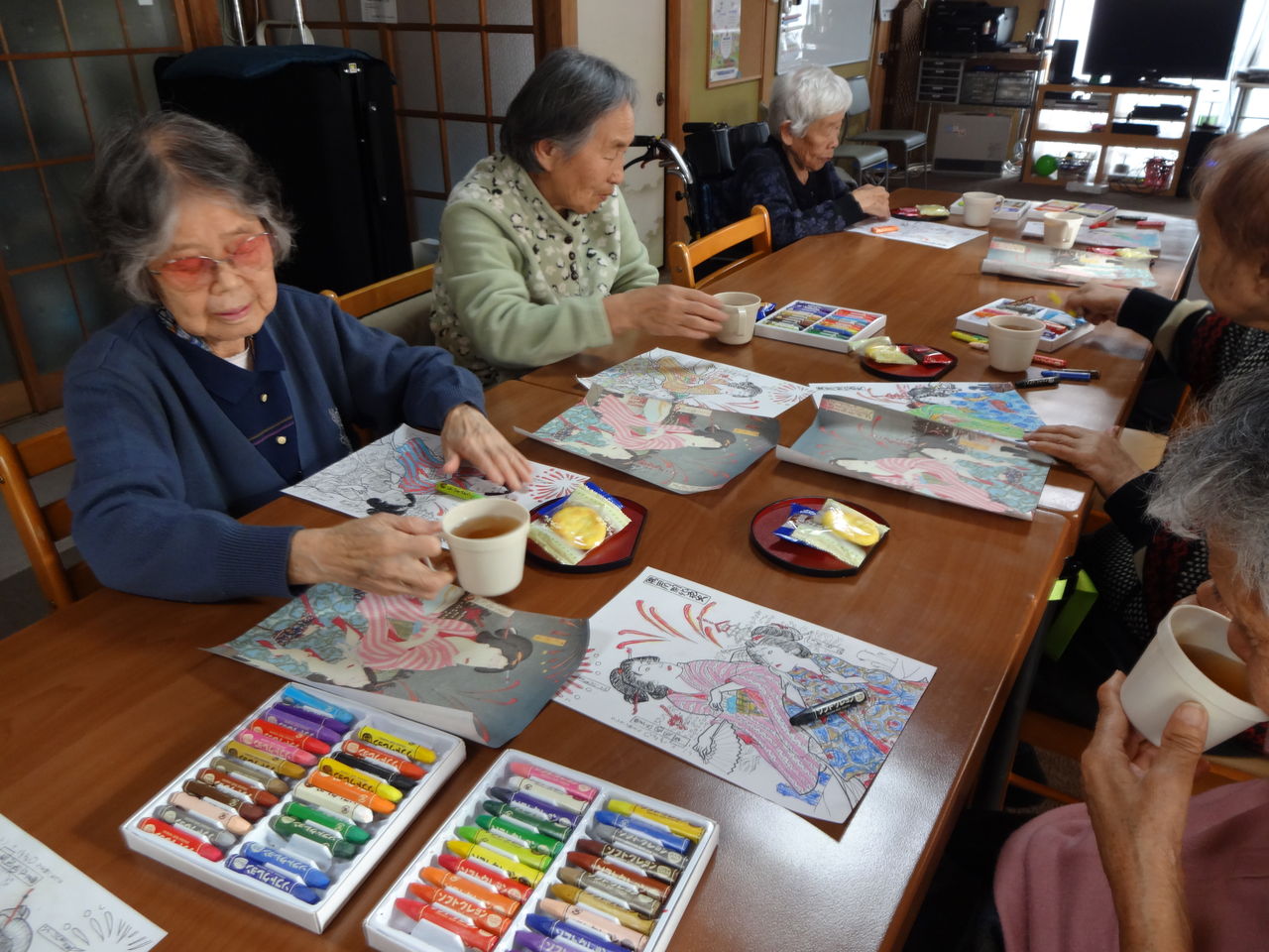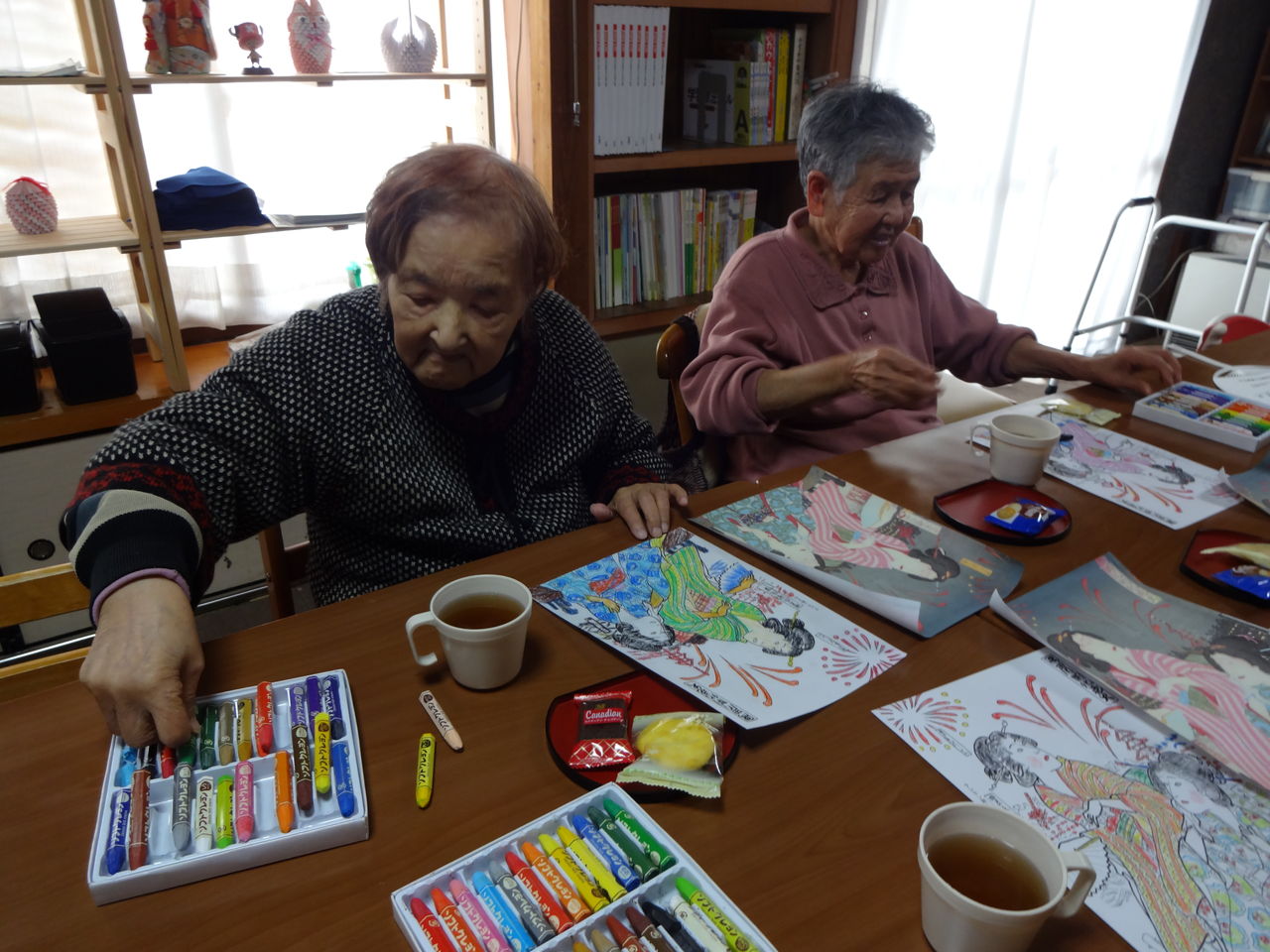 展覧会の(ぬり)絵 2014.02.15 06:56 今日は皆さんで‘ぬり絵’を楽しみました“こんなの何年ぶりよ~” “上手く塗れないわ~”と言いながらも、真剣な面持ちで取り組んでいました 同時に子どもの頃の思い出等の話にも花がさきました(会話の様子が伝えられないのがとても残念です)