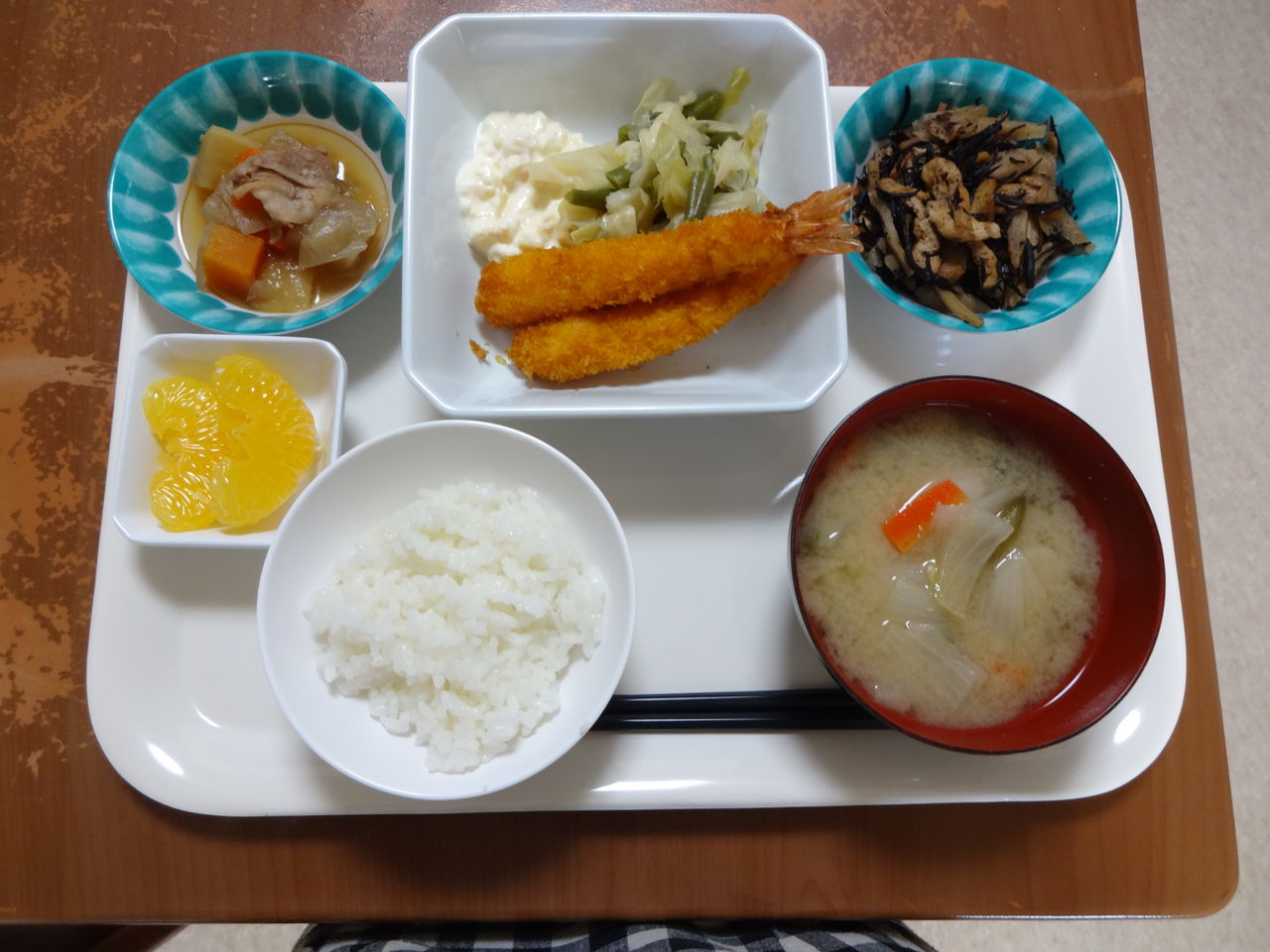 本日のメニュー 2014.02.25 04:52 本日のメニューです〈2月25日)〈昼食〉 主食 ご飯 味噌汁主菜 海老フライ副菜 豚肉と大根の煮物添物 ひじきの五目煮 キャベツといんげんのソテー タルタルソース〈夕食〉 主食 天津ドン 中華春雨スープ添物 ひじきとゴボウの煮物 生姜漬け