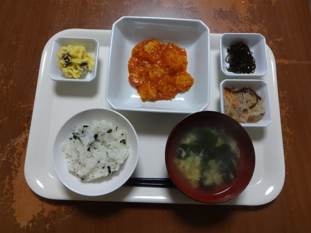 本日のメニュー 2014.02.28 06:22 本日のメニューです(2月28日)〈昼食〉 〈夕食〉 主食 わかめごはん 卵スープ主采 エビのチリソース副菜 中華春雨添物 おさつサラダ 昆布と山椒の佃煮