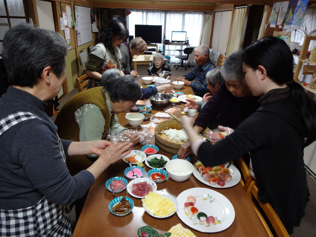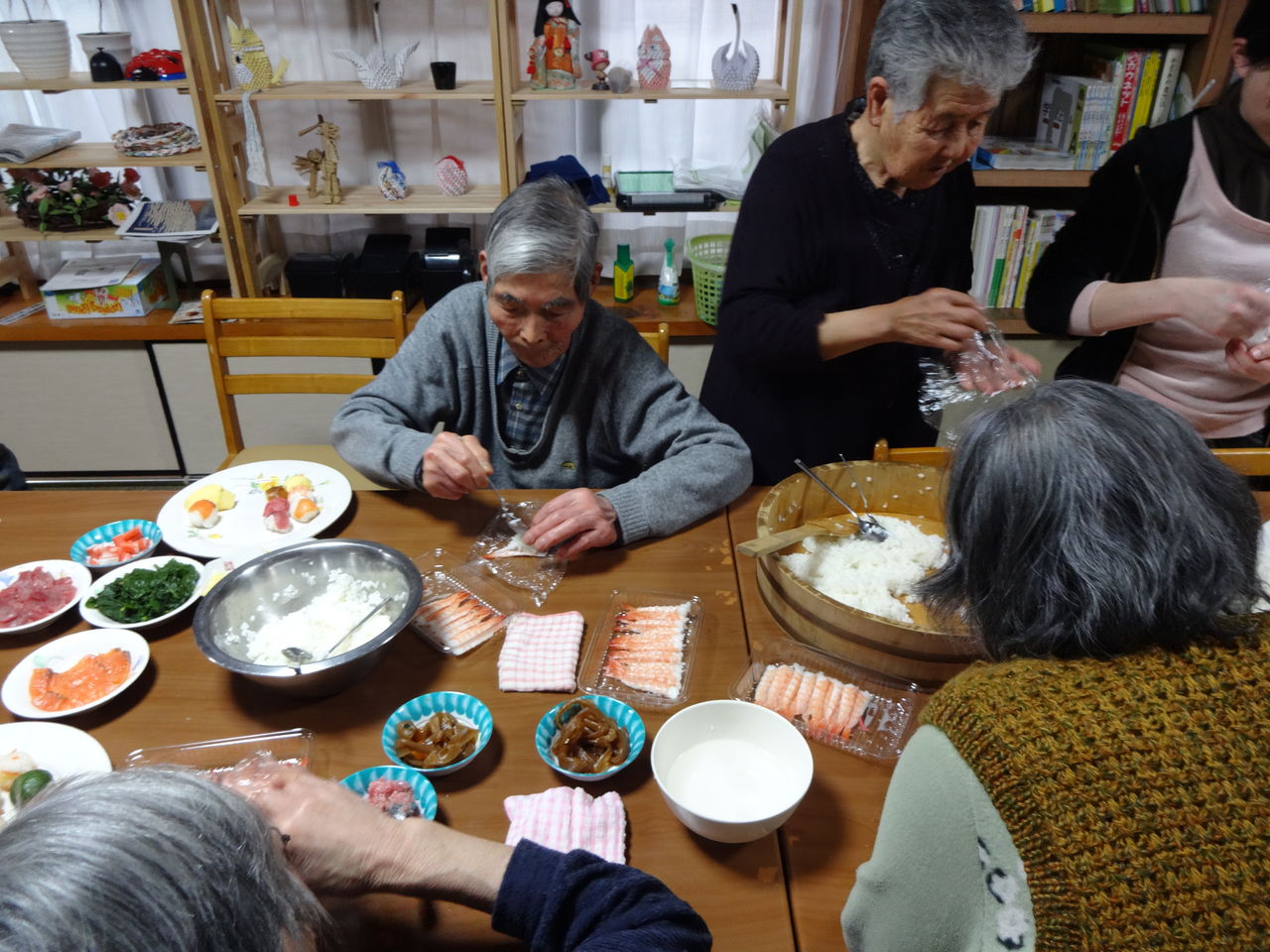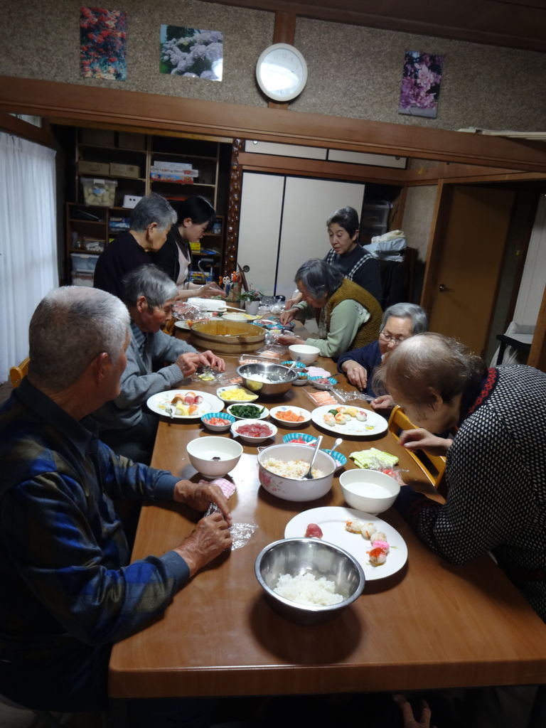 2日遅れの雛祭り 2014.03.05 13:00 今日は、2日遅れの雛祭りということで、みんなで❛手鞠寿司作り❜をしました 最初はみなさん「上手く出来るかなぁ~」と不安そうでしたが・・・ 時間が経つうちに「楽しい」「面白い」と、どんどんと作り進めていきました。 最後に出来上がった寿司の前で、皆さんの満足気な顔を“パチリ”