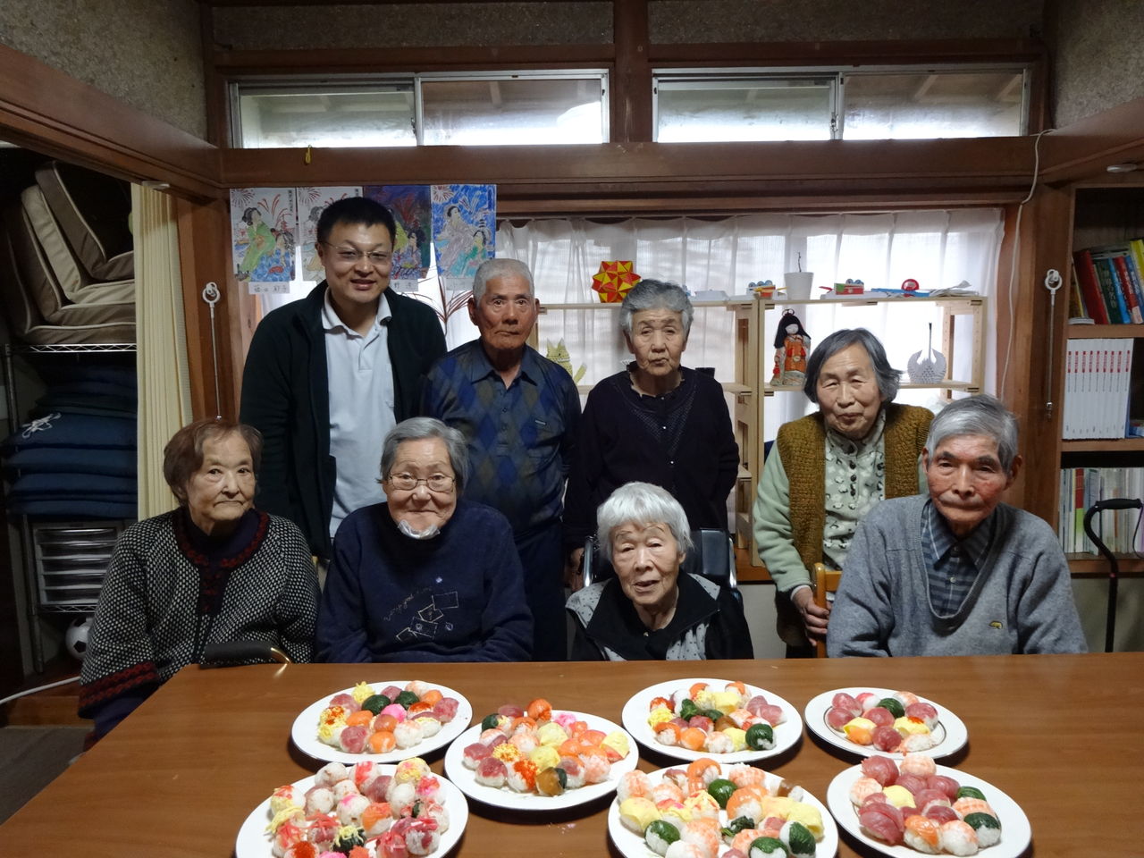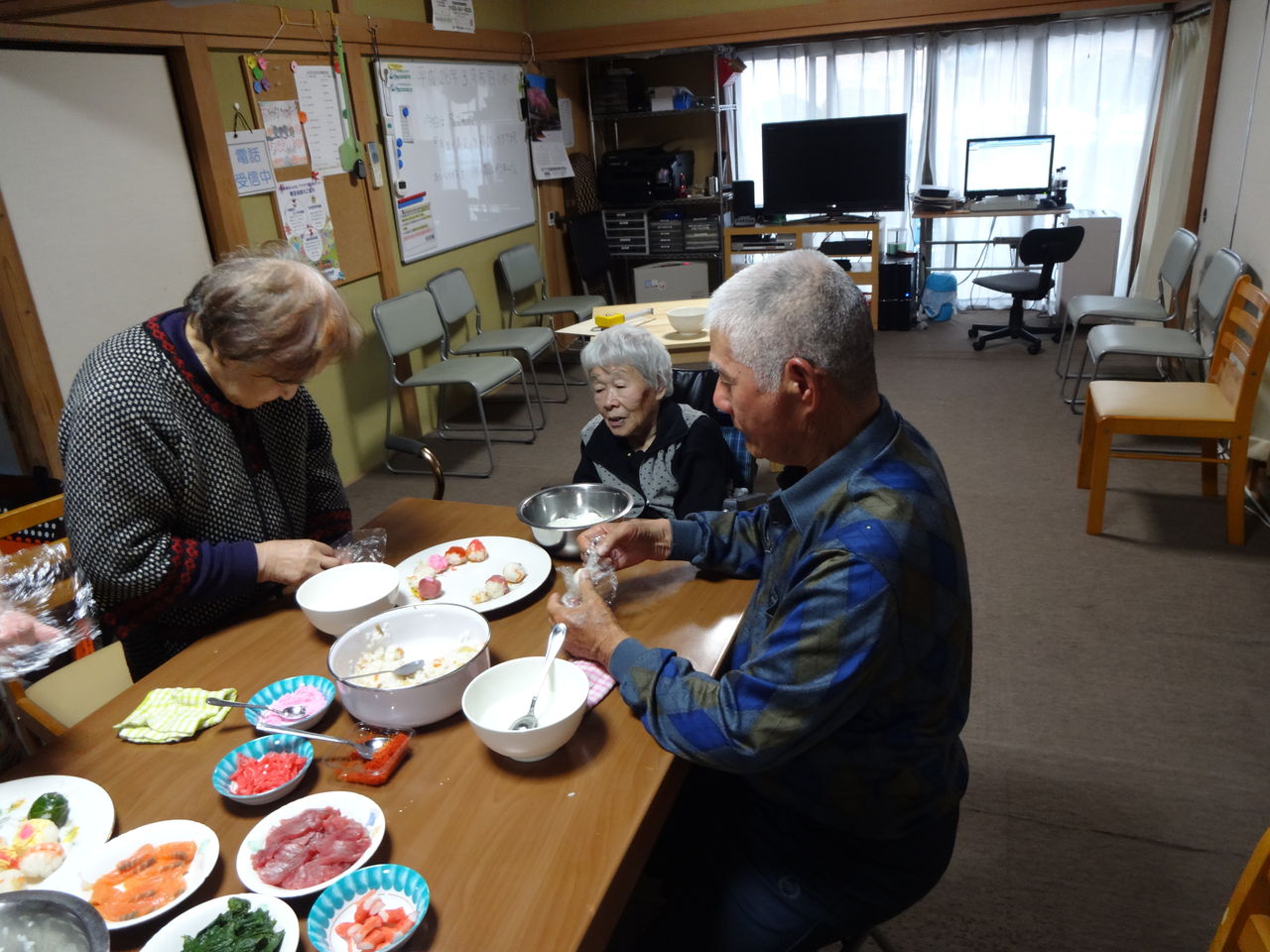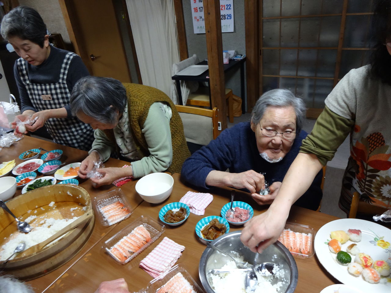 2日遅れの雛祭り 2014.03.05 13:00 今日は、2日遅れの雛祭りということで、みんなで❛手鞠寿司作り❜をしました 最初はみなさん「上手く出来るかなぁ~」と不安そうでしたが・・・ 時間が経つうちに「楽しい」「面白い」と、どんどんと作り進めていきました。 最後に出来上がった寿司の前で、皆さんの満足気な顔を“パチリ”