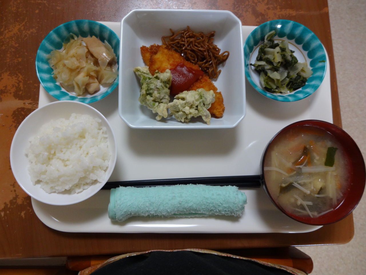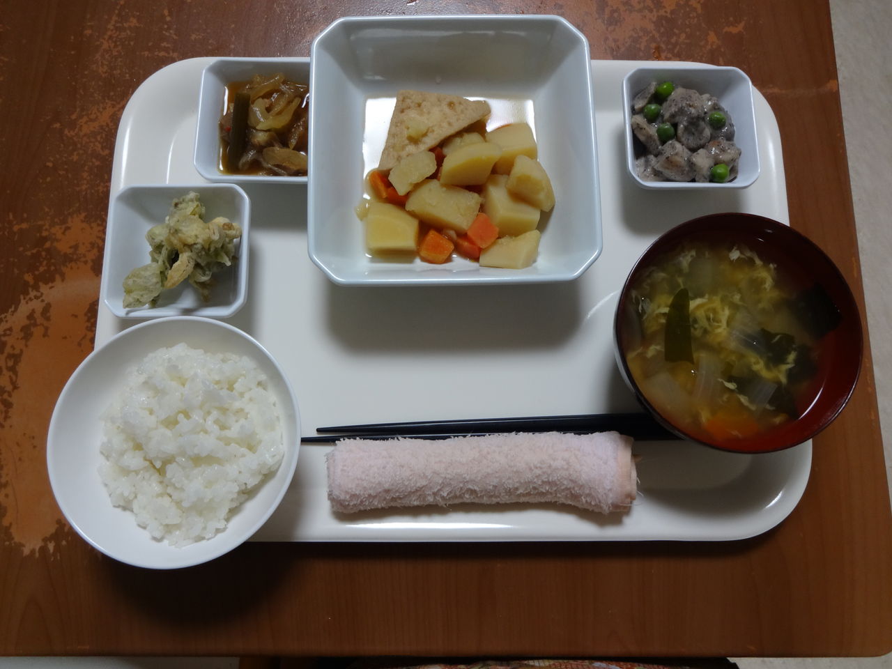 本日のメニュー 2014.03.12 07:17 本日のメニューです(3月12日)〈昼食〉 主食 ご飯 味噌汁主菜 白身フライ副菜 はんぺんとキャベツの煮物添物 大根と青菜のゆず和え 具なし焼きそば ふきのとうのテンプラ〈夕食〉 主食 ご飯 野菜のかきたま汁主菜 ジャガイモと揚げの煮物副菜 鶏肉の韓国麩炒め添物 おつゆ麩の胡麻和え ふきのとうのテンプラ