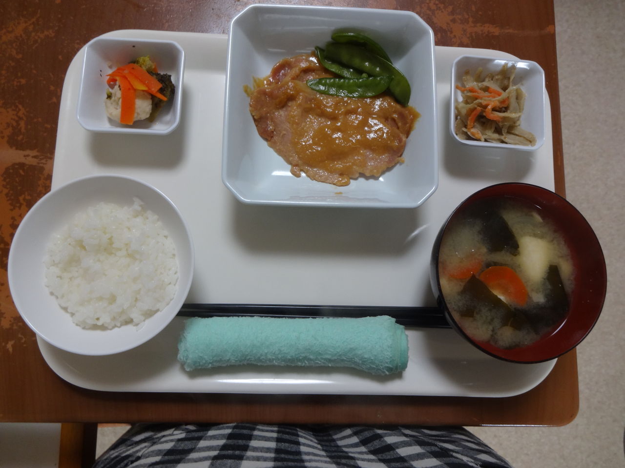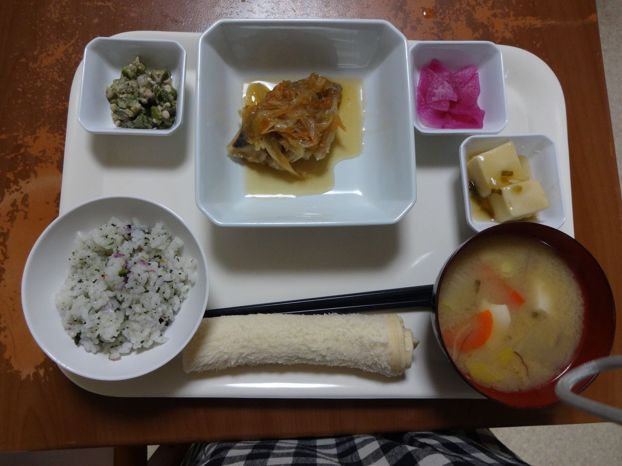 本日のメニュー 2014.03.14 06:43 本日のメニューです(3月14日)〈昼食〉 主食 ご飯 味噌汁主菜 豚肉のみそ漬焼副菜 ごぼうと人参の胡麻マヨ添物 温野菜サラダ 味付けきぬさや〈夕食〉 主食 混ぜご飯 トン汁主菜 あじの南蛮漬副菜 豆腐のくずあん添物 刻みオクラの胡麻和え 赤大根