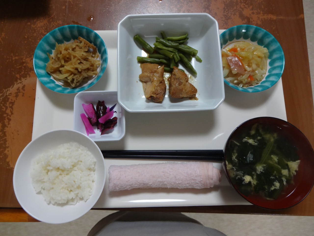 本日のメニュー 2014.03.22 04:15 本日のメニューです(3月22日)〈昼食〉 主食 ご飯 味噌汁主菜 野菜コロッケ副菜 白菜とふの卵とじ添物 菜の花とツナの辛し和え 蕗味噌 具なし焼きそば〈夕食〉 主食 ご飯 野菜入り卵スープ主菜 鳥の酒蒸し煮副菜 中華うま煮添物 切り干し大根煮 いんげんソテー 蕗のテンプラ
