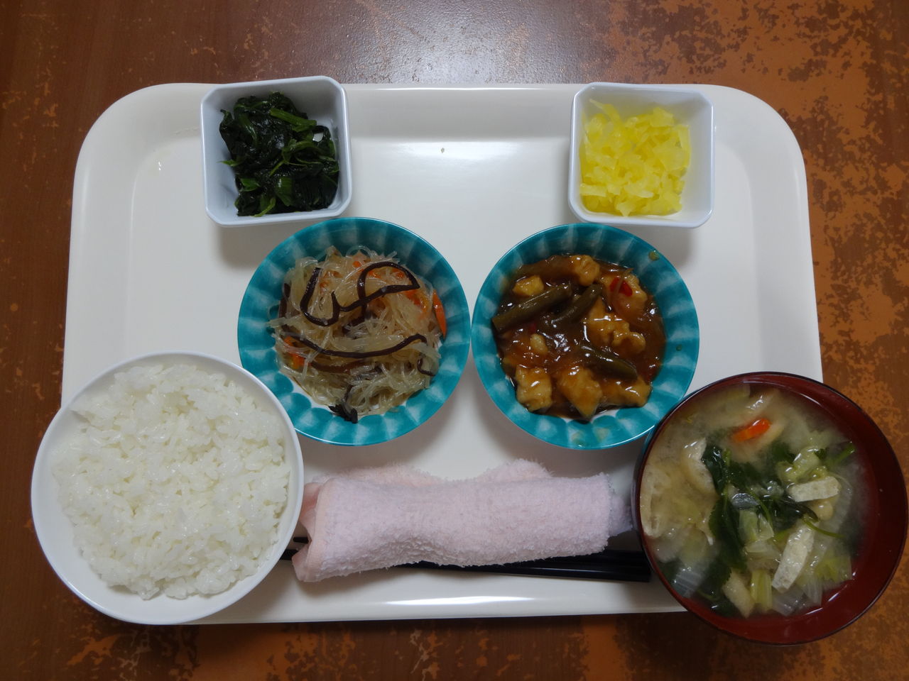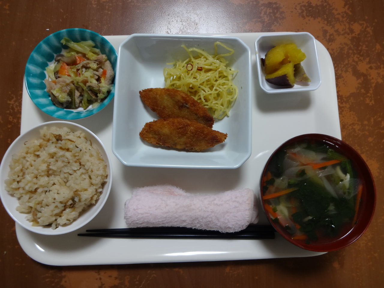 本日のメニュー 2014.03.25 10:47 本日のメニューです(3月25日) 〈昼食〉 主食 ご飯 味噌汁 主菜 揚げ鶏と彩野菜のオイスター炒め 副菜 中華春雨 添物 ほうれん草のお浸し 刻みたくあん 〈夕食〉 主食 あさりの炊き込みご飯 野菜スープ 主菜 白身フライ 副菜 お肉風大豆たんぱくの五目炒め 添物 さつま芋甘露煮