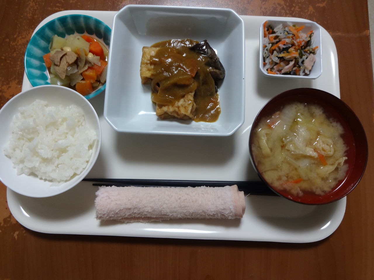 本日のメニュー 2014.03.29 10:16 本日のメニューです(3月29日)〈昼食〉 おにぎり(梅・焼おにぎり) ウインナー 卵焼き 漬物 (ウインナーと焼おにぎりは卓上コンロ持参で、その場で焼きました)〈夕食〉 《腎臓病食》 主食 カルビ丼 味噌汁の具のみ 副菜 筍とわかめのクリーム煮 添物 人参と春雨のサラダ 粉ふきいも 《普通食》 主食 ご飯 味噌汁 主菜 揚げ豆腐のカレーあん 副菜 大豆の肉じゃが煮 添物 春雨のピーナッツ和え
