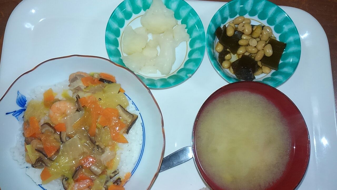 本日のメニュー 2017.01.09 11:17 本日のメニューです(1月9日) 昼食 主食 中華丼 味噌汁 副菜 昆布と大豆の煮物 添え物 カリフラワーの甘酢漬け夕食主食 ごはん 味噌汁主菜 赤魚の酒粕焼き副菜 ポテト煮 コールスローサラダ