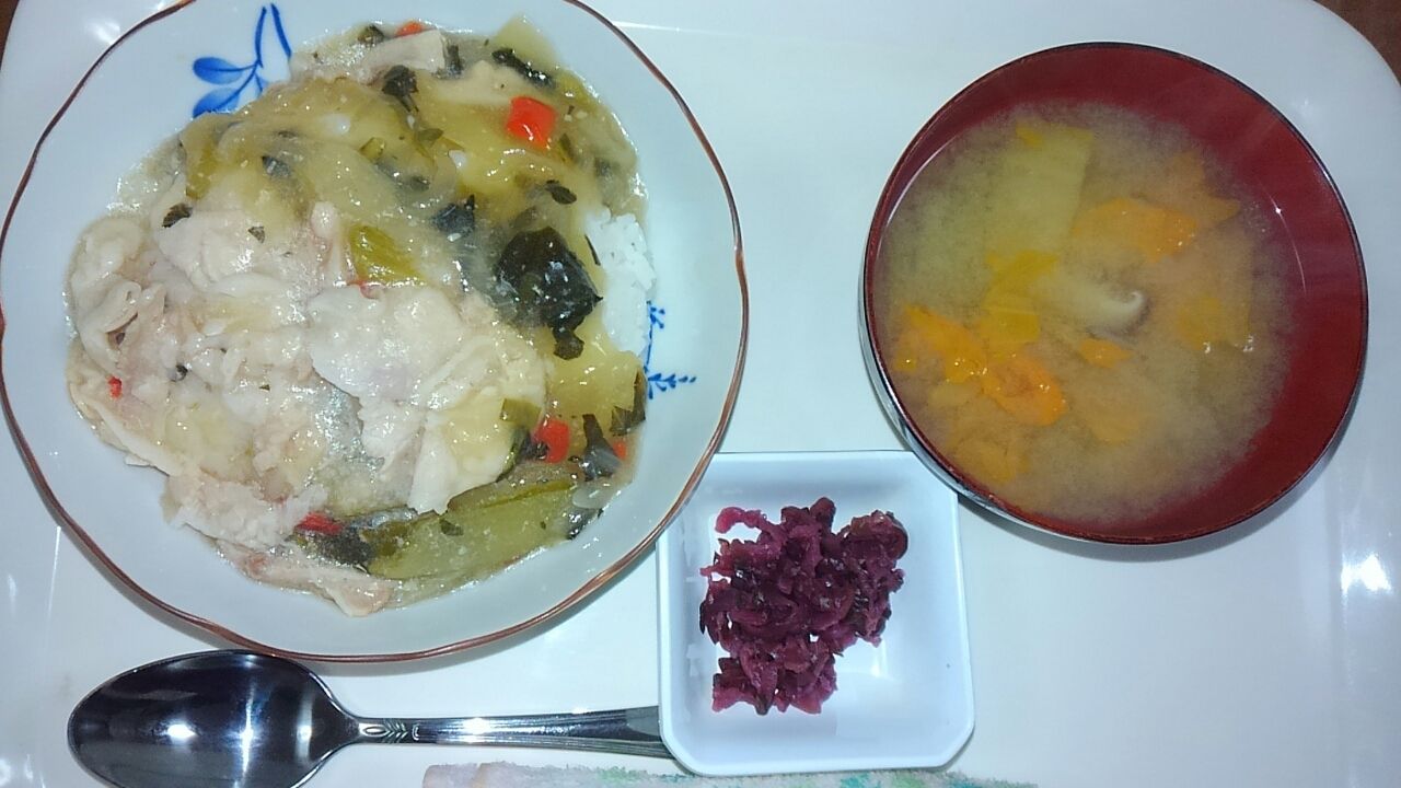 本日のメニュー 2017.01.11 11:47 本日のメニューです(1月11日) 昼食 主食 塩豚丼 味噌汁 添え物 茄子紫蘇風味夕食主食 ごはん 味噌汁主菜 焼き餃子副菜 カリフラワーとソーセージのハーブソテー ほうれん草と菊の和え物添え物 ちりめん昆布