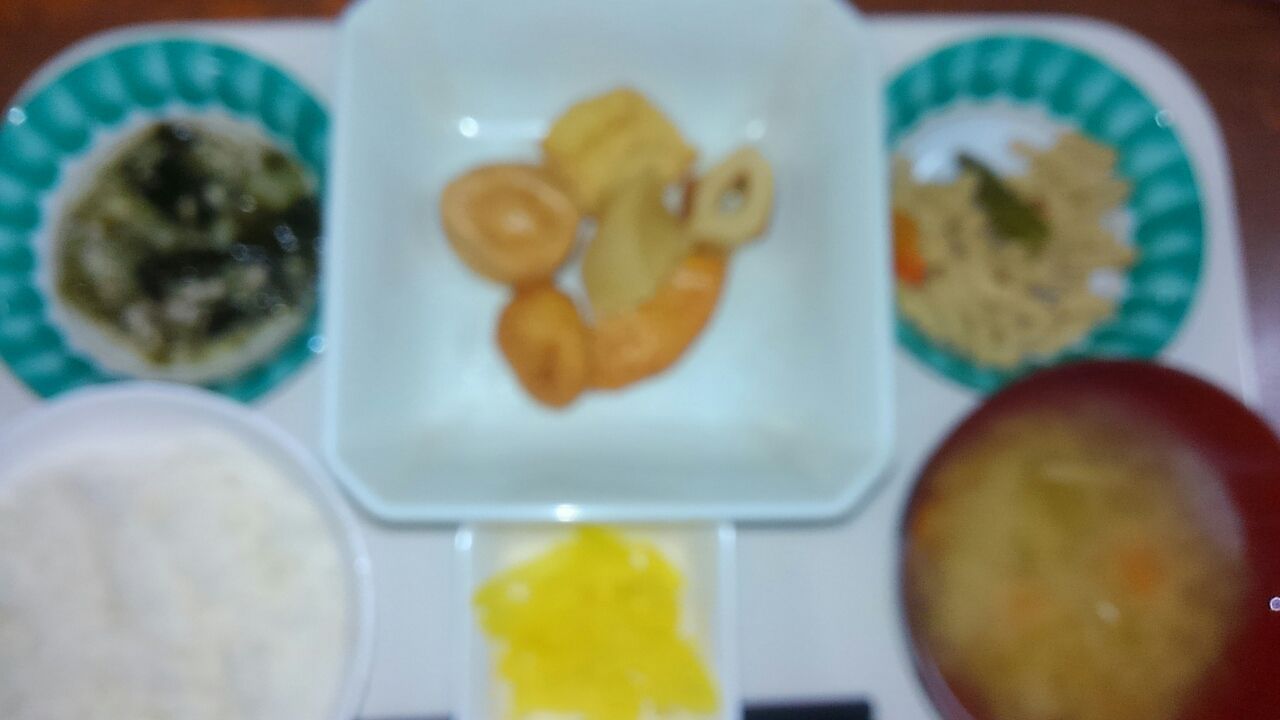 本日のメニュー 2017.01.18 11:15 本日のメニューです(1月18日) 昼食 主食 ごはん 味噌汁 主菜 おでん 副菜 高野豆腐煮 オクラと若芽のワサビ和え 添え物 刻みたくあん夕食主食 ごはん 味噌汁主菜 ポークチャップ副菜 大学芋 キャベツと枝豆のソテー風添え物 白菜と菜の花の浅漬け