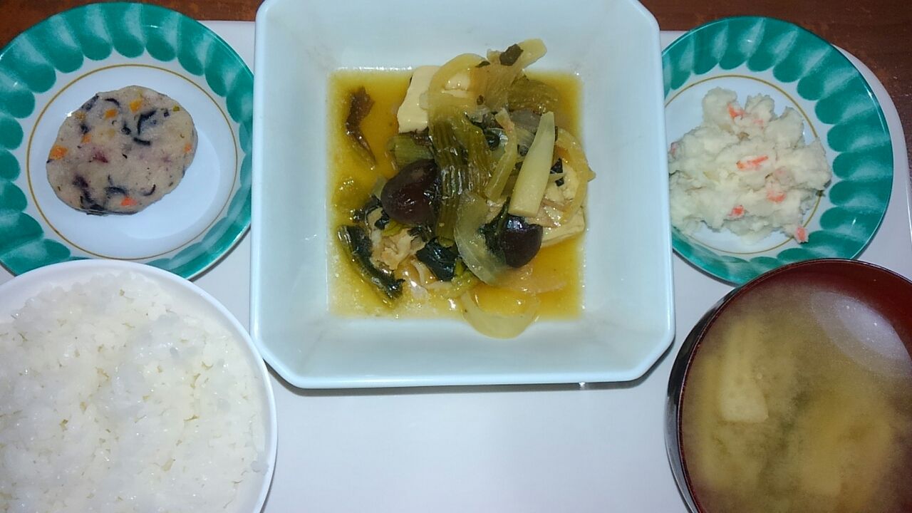本日のメニュー 2017.01.27 11:11 本日のメニューです(1月27日) 昼食 主食 ごはん 味噌汁 主菜 くずし豆腐と豚肉の煮物 副菜 海鮮バーグ 添え物 ポテトサラダ夕食主食 ごはん 味噌汁主菜 アジレモン醤油焼き副菜 ペンネのソテー風 チンゲン菜のピーナッツ和え