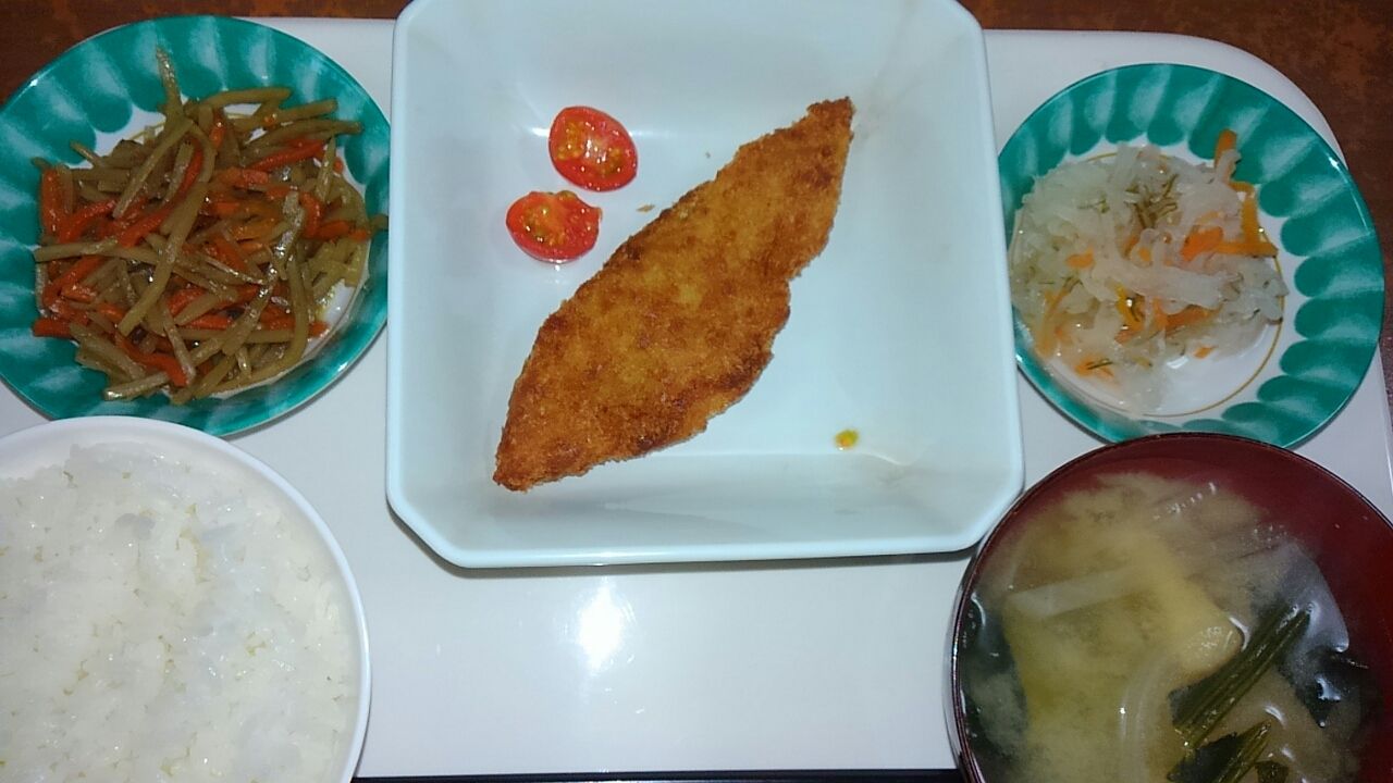 本日のメニュー 2017.01.30 11:13 本日のメニューです(1月30日) 昼食 主食 ごはん 味噌汁 主菜 白身フライ 副菜 きんぴらゴボウ 添え物 なます夕食主食 ごはん 味噌汁主菜 牛肉と野菜の中華炒め副菜 ベジタブルオムレツ ほうれん草の胡麻浸し