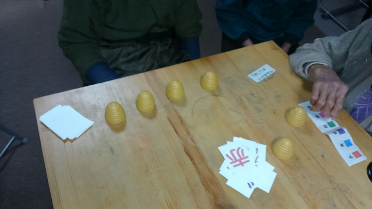 ぶんぶんかくれんぼ 2017.01.30 11:14 記憶のレクレーションで、ぶんぶん かくれんぼです。 6色のハチをかぶせて色を当てます。 最後の5回目でスムーズに色を当て て一人勝ちで終わりました。