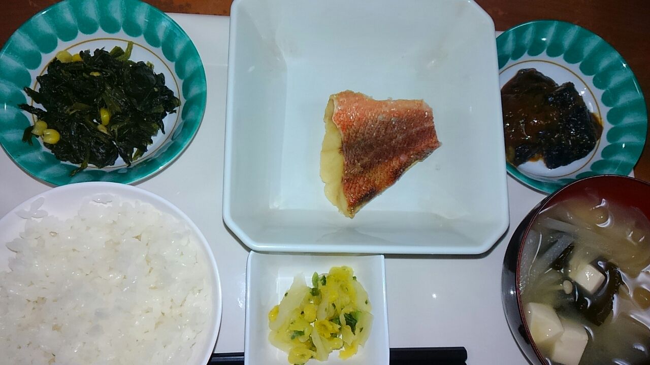 本日のメニュー 2017.02.01 11:16 本日のメニューです(2月1日) 昼食 主食 ごはん 味噌汁 主菜 赤魚の塩焼き 副菜 茄子の田楽風 ほうれん草とコーンの和え物 添え物 白菜と菜の花の浅漬け夕食主食 ごはん 味噌汁主菜 春雨と豚肉の炒め煮副菜 絹ごし揚げのオイスターあん ビーンズサラダ添え物 細切り昆布