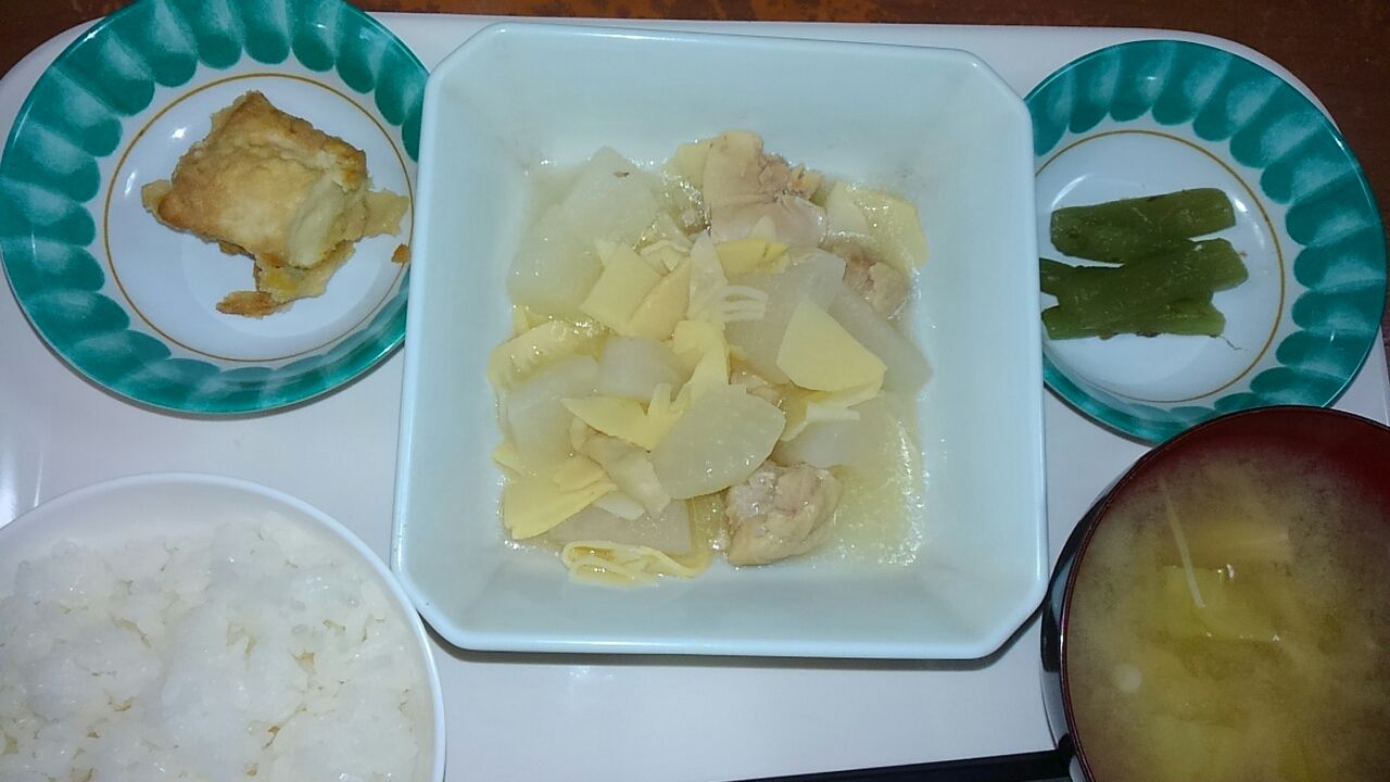 本日のメニュー 2017.02.03 11:16 本日のメニューです(2月3日) 昼食 主食 ごはん 味噌汁 主菜 鶏と大根の中華煮 副菜 揚げ出し豆腐 添え物 ふき土佐煮夕食主食 ごはん 味噌汁主菜 イワシの梅醤油煮副菜 山芋のそぼろ煮 サンサイスウ添え物 甘酢生姜