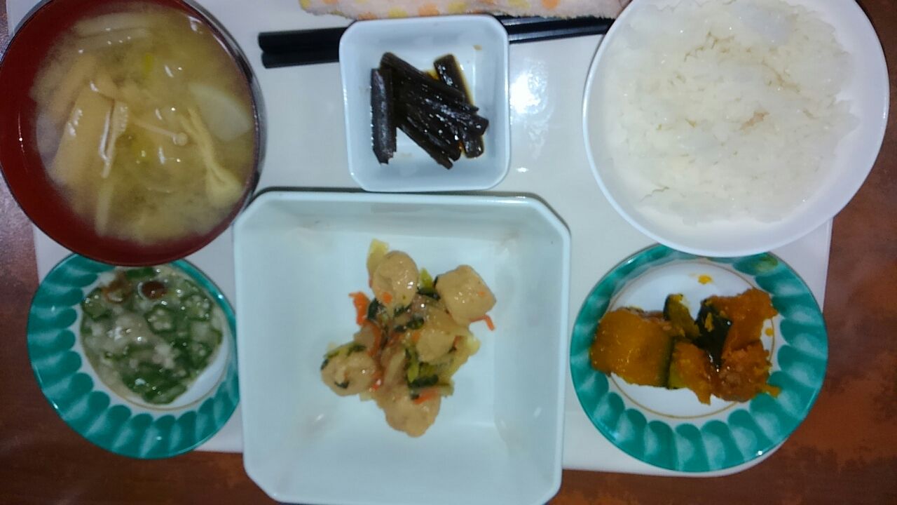 本日のメニュー 2017.02.08 11:10 本日のメニューです(2月8日) 昼食 主食 ごはん 味噌汁 主菜 肉団子と野菜の薄くず餡 副菜 かぼちゃそぼろあん なめこと山芋のオクラ和え 添え物 きゃらぶき夕食主食 ごはん 味噌汁主菜 フィッシュカツ副菜 治部煮風 切り昆布の煮物添え物 しその実漬け