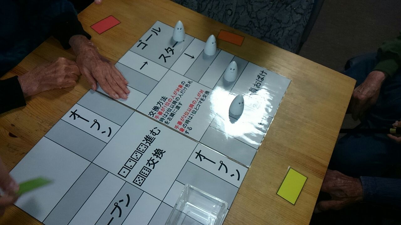 オバケだぞー 2017.02.10 11:12 記憶のレクレーションで、オバケだぞーです。 最初のうちサイコロの数が5、6の 時色カードを交換していたが、自分 のこまが、わからなくなってしまう のでこまを前後するだけにしました。 それでもゴールになってあけてみると 他の人のこまを動かしていました。