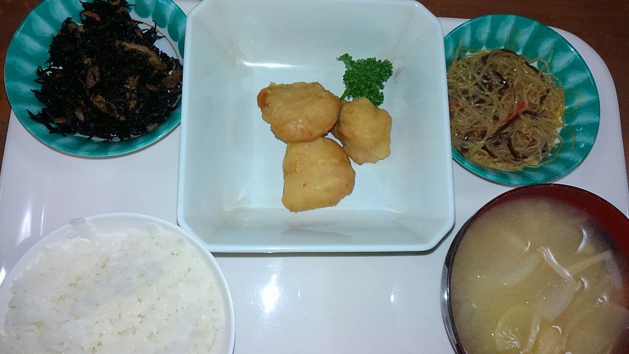 本日のメニュー 2017.02.13 11:16 本日のメニューです(2月13日) 昼食 主食 ごはん 味噌汁 主菜 鶏の唐揚げ 副菜 ひじき煮 添え物 春雨中華サラダ夕食主食 ごはん 味噌汁主菜 アジごまみりん焼き副菜 ジャガイモの葱塩バター れんこんマリネ添え物 花形人参のだし煮