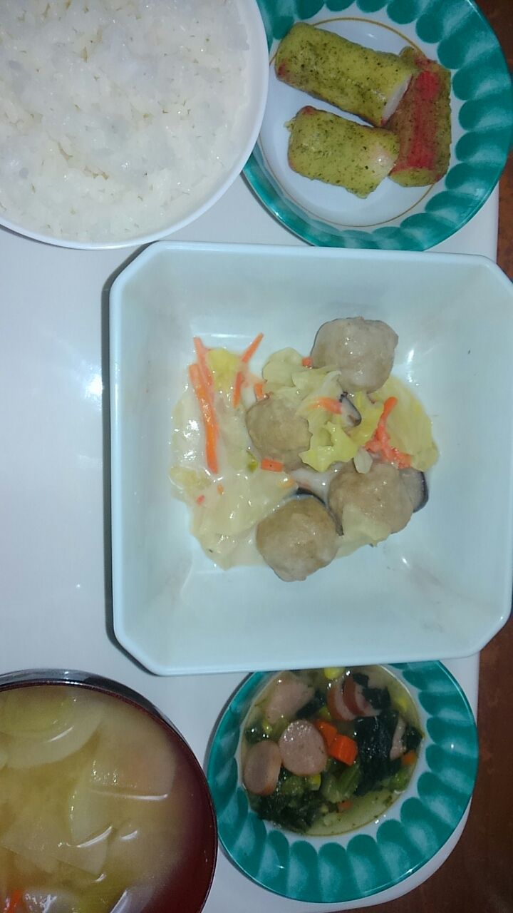 本日のメニューです 2017.02.20 11:17 本日のメニューです(2月20日) 昼食 主食 ごはん 味噌汁 主菜 肉団子と野菜のクリーム煮 副菜 小松菜とウインナーのソテー 添え物 カニかま磯辺天夕食主食 ごはん 味噌汁主菜 さわらのハーブ衣焼き副菜 切干大根煮 オクラとひじきの和え物