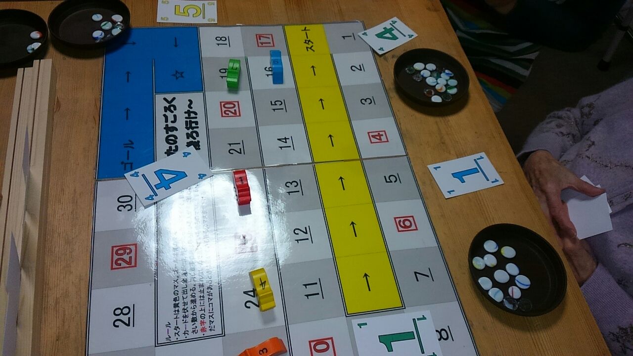 ブタのレース 2017.02.21 11:12 思考のレクレーションで、ブタのレースです。 色のカードでブタを後ろへ、下げるゲームです下がった数だけおはじきが、もらえておはじきの数が、多いと勝ちです。なかなかわからないのでルールを見ながらやっていました。