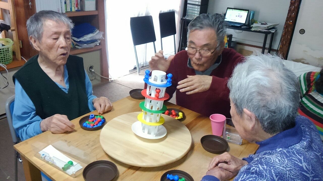 ぐらぐらゲーム 2017.02.28 11:06 バランスのレクレーションで、ぐらぐらゲームです。 人形を順番に載せていくのですが、位置は、色のサイコロで、高さも決まります。載せるのに冷や冷やの瞬間です。皆さん載せるのに真剣でした。