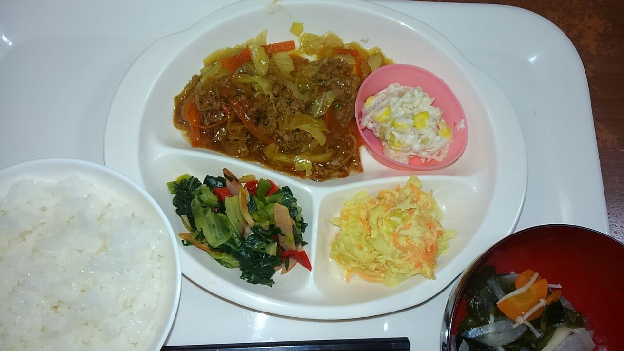 本日のメニュー 2017.03.07 11:09 本日のメニューです(3月7日) 昼食 腎臓食 主食 ごはん 味噌汁 主菜 牛肉と野菜の韓国風炒め 副菜 チンゲンサイとハムの炒め キャベツと蒸し鶏マスタード和え 添え物 カニかまサラダ 昼食 一般食 主食 カレーライス 味噌汁 添え物 福神漬け夕食腎臓食主食 ごはん 味噌汁主菜 天ぷら盛り合わせ副菜 春菊の胡麻和え 鶏肉のケチャップ炒め添え物 煮豆一般食主食 ごはん 味噌汁主菜 タラフライ副菜 ブロッコリーのかに風味あん じゃが芋と椎茸の甘辛炒め添え物 うずら豆