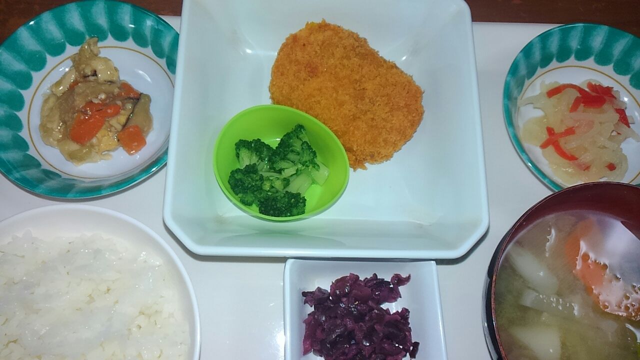 本日のメニュー 2017.03.11 11:06 本日のメニューです(3月11日) 昼食 主食 ごはん 味噌汁 主菜 ポテトコロッケ 副菜 炒り豆腐 紅白なます 添え物 茄子しそ風味夕食主食 ごはん 味噌汁主菜 チキンのトマト煮込み副菜 パスタサラダ しらすといんげんのポン酢和え添え物 拍子切り青菜大根