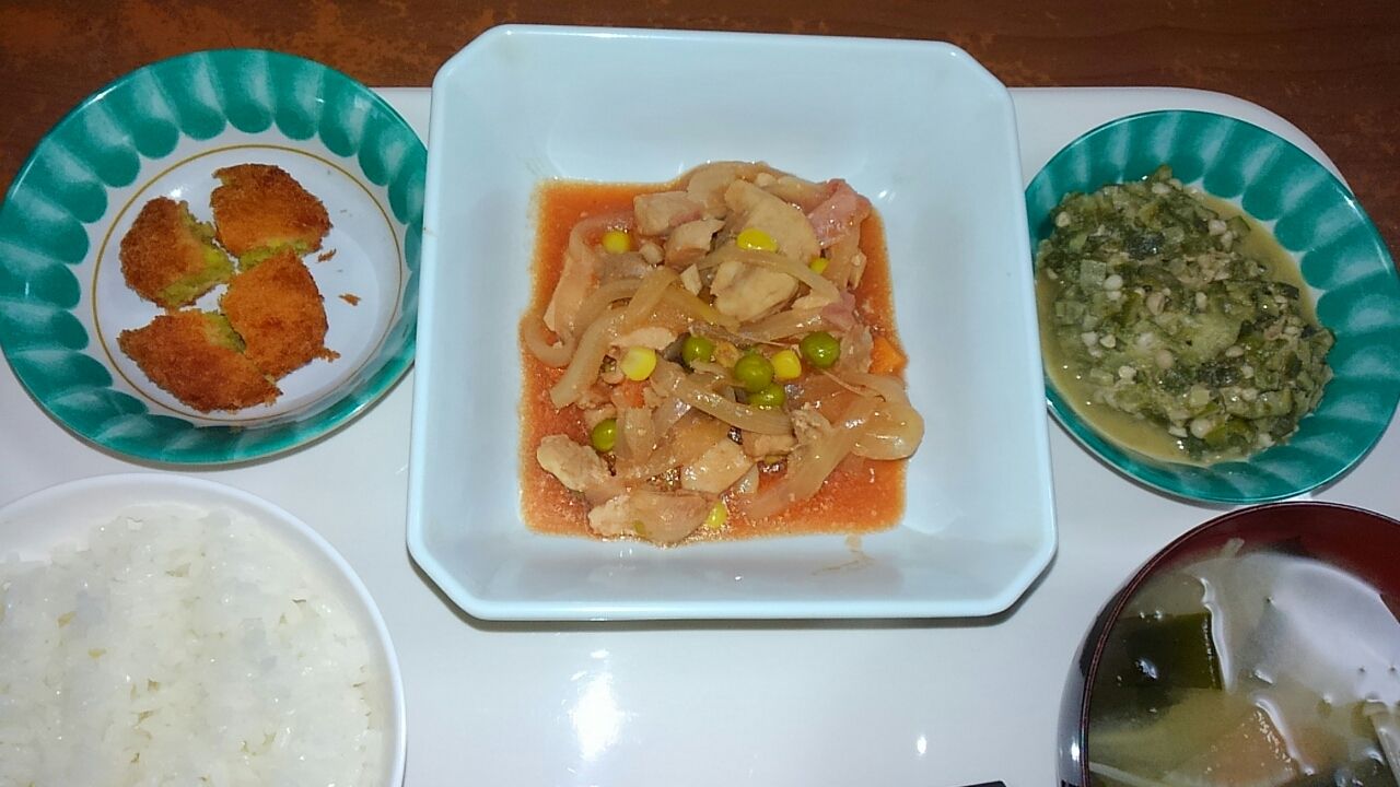 本日のメニュー 2017.03.13 11:09 本日のメニューです(3月13日) 昼食 主食 ごはん 味噌汁 主菜 チキンのトマト煮込み 副菜 カレーコロッケ 添え物 オクラのゴマ和え夕食主食 ごはん 味噌汁主菜 さば山椒焼き副菜 厚揚げと小松菜の生姜煮 れんこんマリネ
