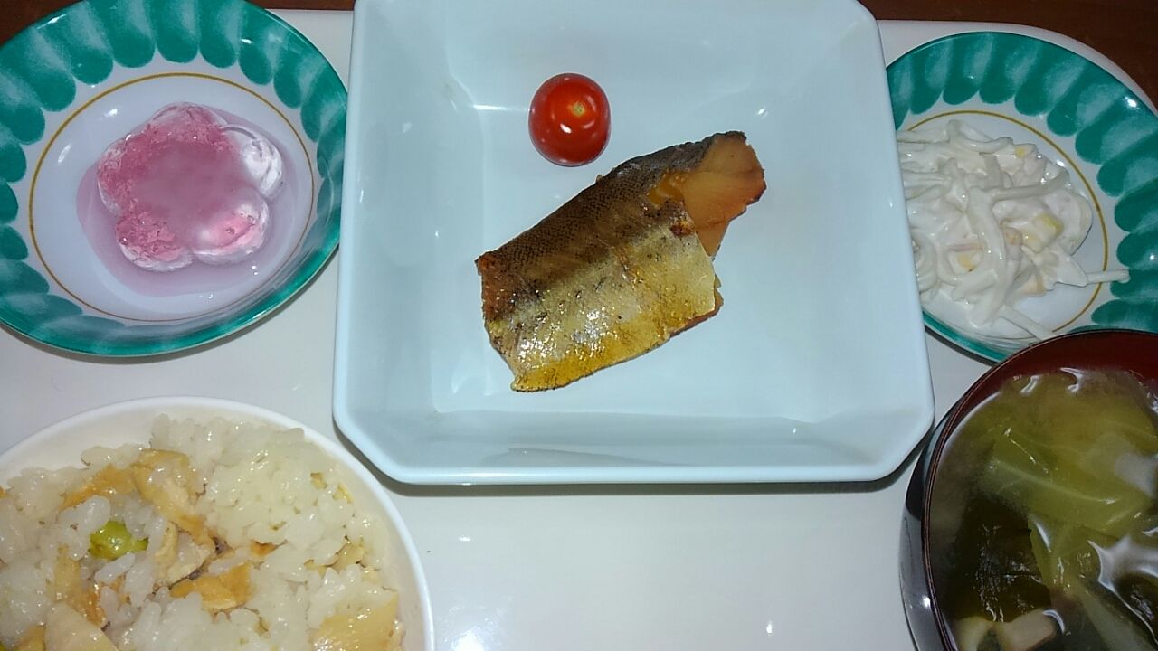 本日のメニュー 2017.03.20 11:04 本日のメニューです(3月20日) 昼食 主食 筍ごはん 味噌汁 主菜 スケソウたら塩麹焼き 副菜 スパゲッティーサラダ 添え物 サクラゼリー夕食主食 ごはん 味噌汁主菜 牛肉と大根の煮物副菜 海鮮バーグ ぜんまいともやしのナムル