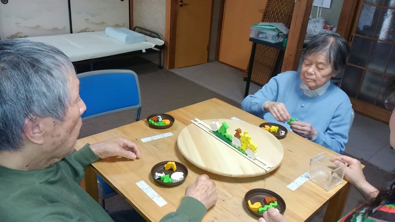 ワニにのる 2017.03.28 06:27 バランスのレクレーションで、ワニにのるです。皆さん慎重に動物の駒を載せていました。それにワニの前後に駒がおけるサイコロの目がでたので載せやすかったようです。