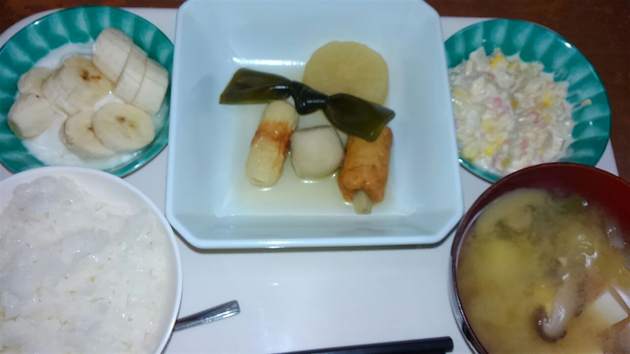 本日のメニュー 2017.03.31 11:10 本日のメニューです(3月31日) 昼食 主食 ごはん 味噌汁 主菜 おでん 副菜 コールスローサラダ 添え物 バナナヨーグルト夕食主食 ごはん 味噌汁主菜 さわらハーブ衣焼き副菜 小松菜とウィンナーのソテー サラダ春雨