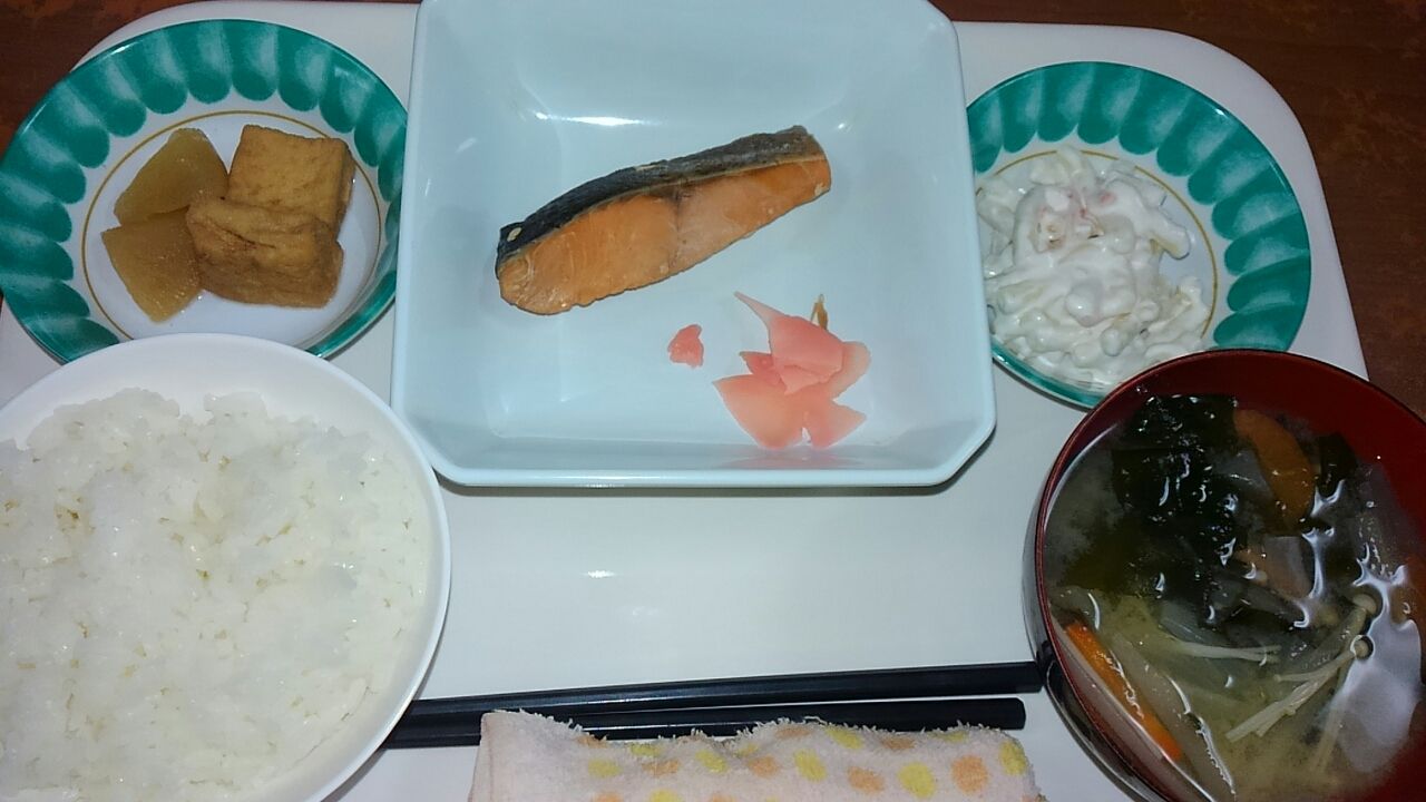 本日のメニュー 2017.04.03 11:10 本日のメニューです(4月3日) 昼食 主食 ごはん 味噌汁 主菜 鮭ポン酢風味焼き 副菜 厚揚げと大根の煮物 副菜 マカロニサラダ夕食 主食 ごはん 味噌汁主菜 豚肉と野菜のケチャップ炒め副菜 お好み焼き わかめの酢の物