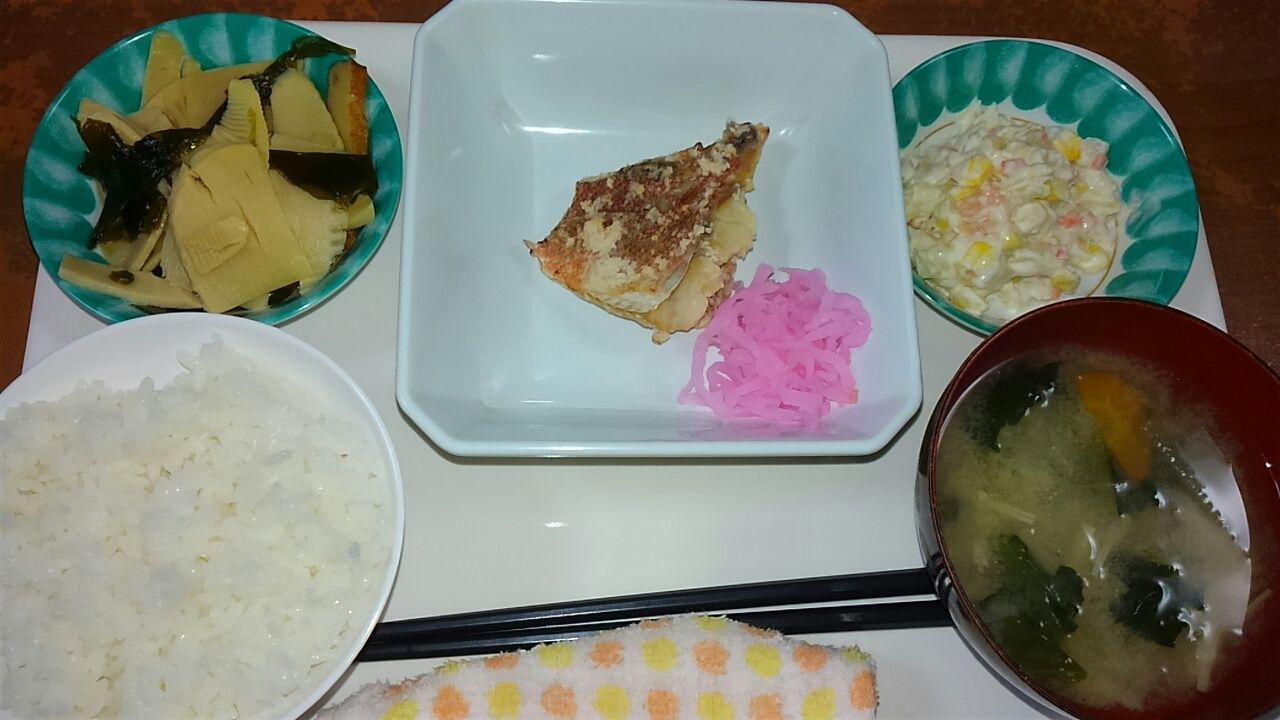 本日のメニュー 2017.04.10 11:25 本日のメニューです(4月10日) 昼食 主食 ごはん 味噌汁 主菜 豆腐の和風野菜あんかけ 副菜 菜の花の梅和え 添え物 さつまいも林檎バター煮風 夕食 主食 ごはん 味噌汁 主菜 赤魚粕漬け焼き 副菜 若竹煮 添え物 コールスローサラダ