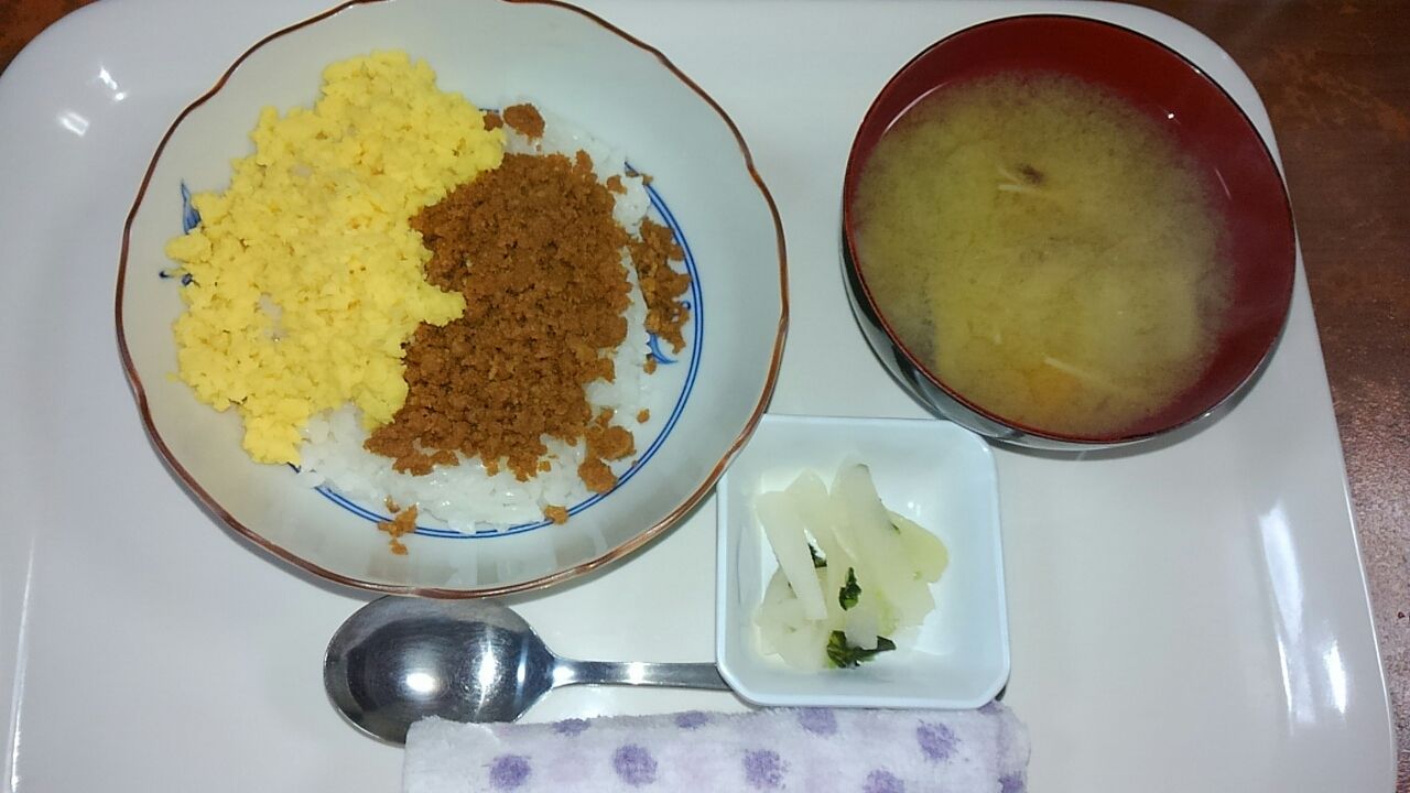 本日のメニュー 2017.04.11 11:04 本日のメニューです(4月11日) 昼食 主食 親子そぼろ 味噌汁 添え物 拍子切り青菜大根夕食 主食 ごはん 味噌汁主菜 天ぷら盛り合わせ副菜 炒り豆腐 紅白なます添え物 なすしそ風味